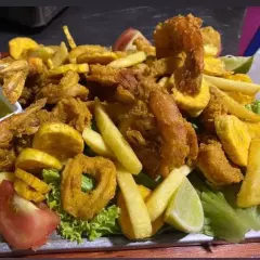 Filete de pescado, camarón, langostino, papa o yuca y plátano.