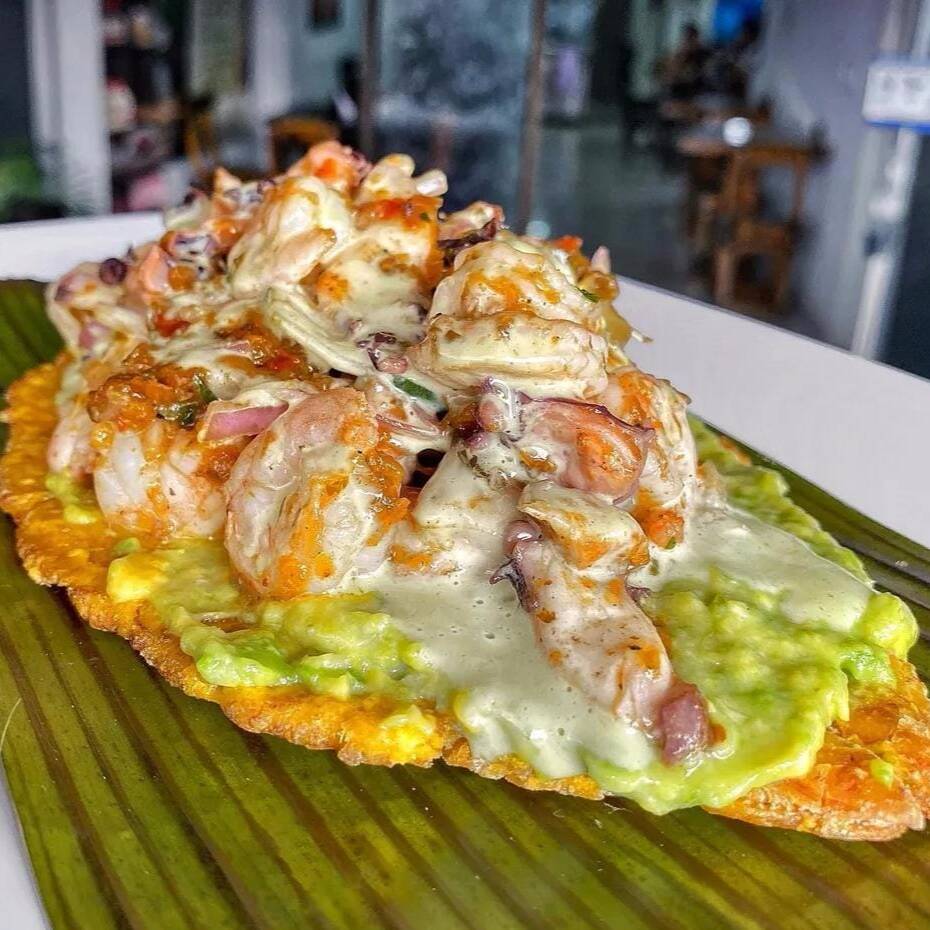 Camarones y calamares sobre cama de aguacate ligeramente picante, servido sobre patacón grande de plátano verde.