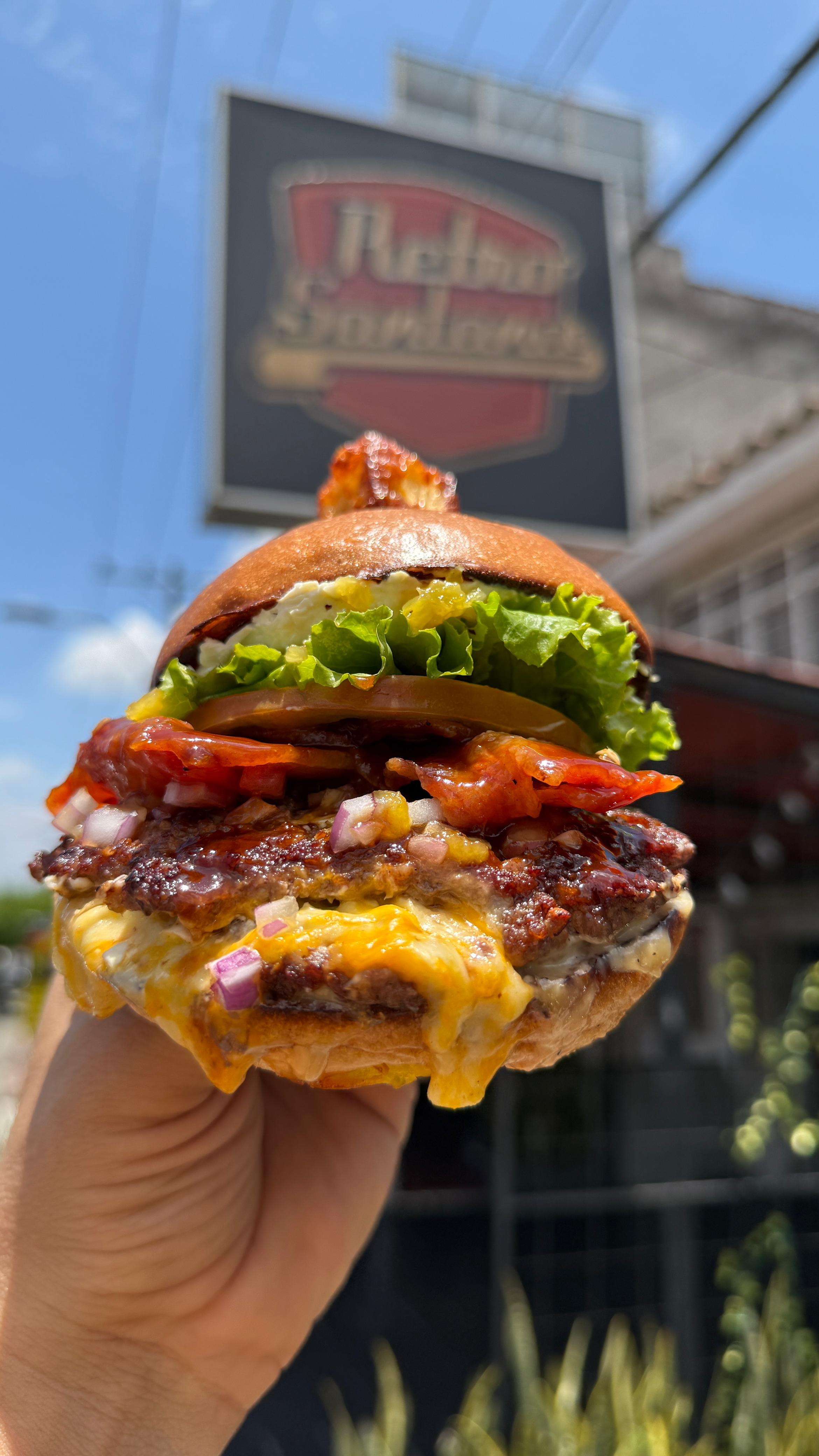 Hamburguesa #3 del burgerstar 2022 con carne 100% Angus, queso philadelphia, piña calada, salami o tocineta a elección, lechuga, tomate, pan artesanal, alioli de ajo dulce con acompañamiento y bebida a elección.