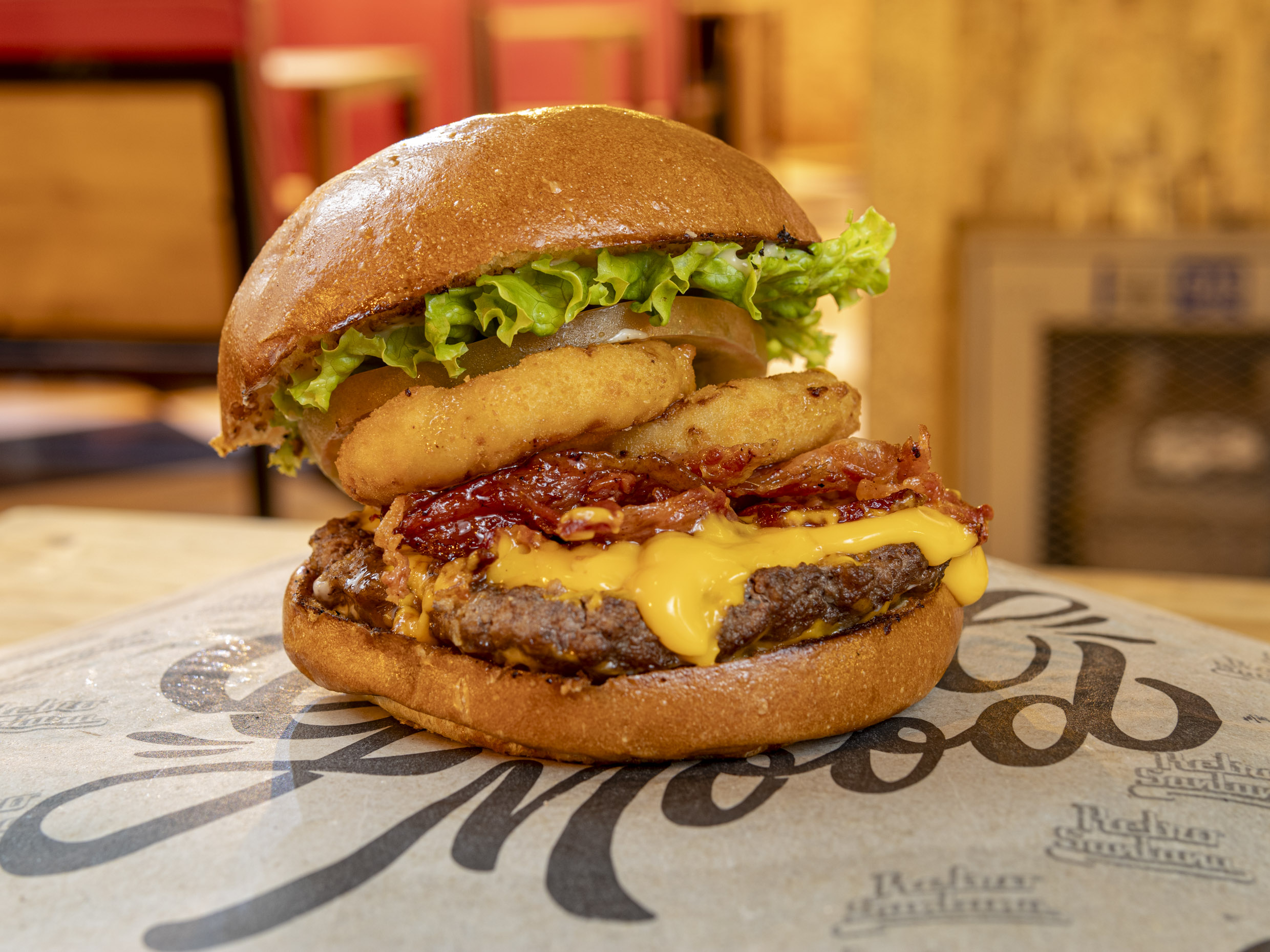 Doble carne Angus estilo smash, con un núcleo fundente de queso mozzarella y cheddar. Cebolla encurtida, tocineta caramelizada en salsa asiática Tokio. Queso Philadelphia mezclado con mermelada de frutos amarillos, al final, una crispeta de queso
