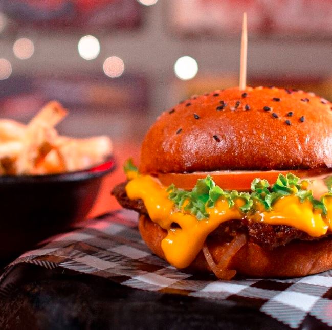 Hamburguesa #1 del BurgerFest 2020, Burger Chicago Bacon con carne Angus, queso cheddar, pepinillos agridulces de la casa, tocineta ahumada, lechuga, tomate, pan brioche receta original, salsa de tomate, mayonesa y mostaza heinz