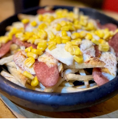 La mejor salchipapa de 2023: papas para compartir, salsa de salsa de ajo dulce de la casa, carne angus en trocitos, tocineta, queso mozzarella apanado, salchichas apanadas en pinchos y queso cheddar.