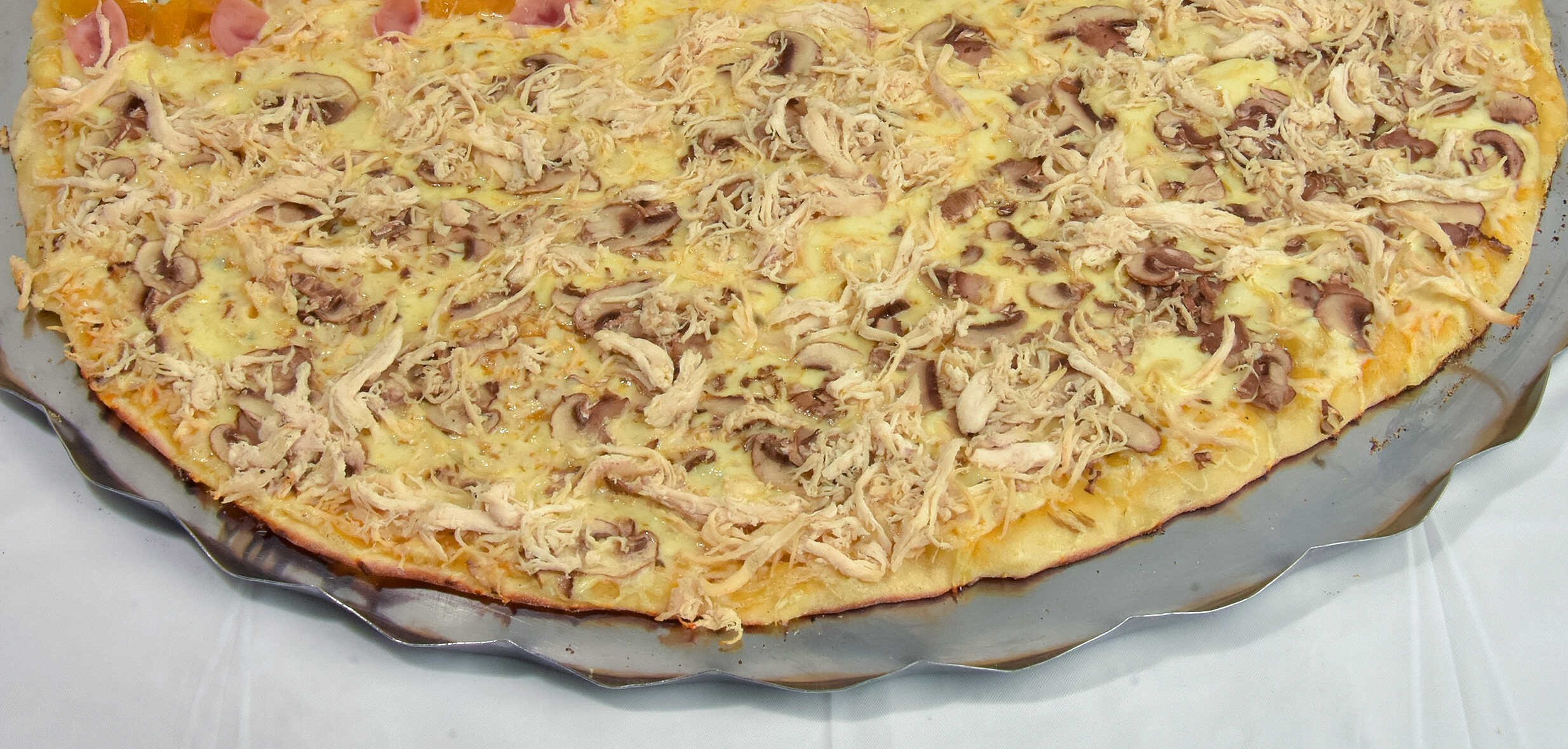Masa Artesanal, salsa napolitana, Queso, pollo y champiñones.
