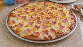 Masa Artesanal, salsa napolitana, jamon, queso y piña.