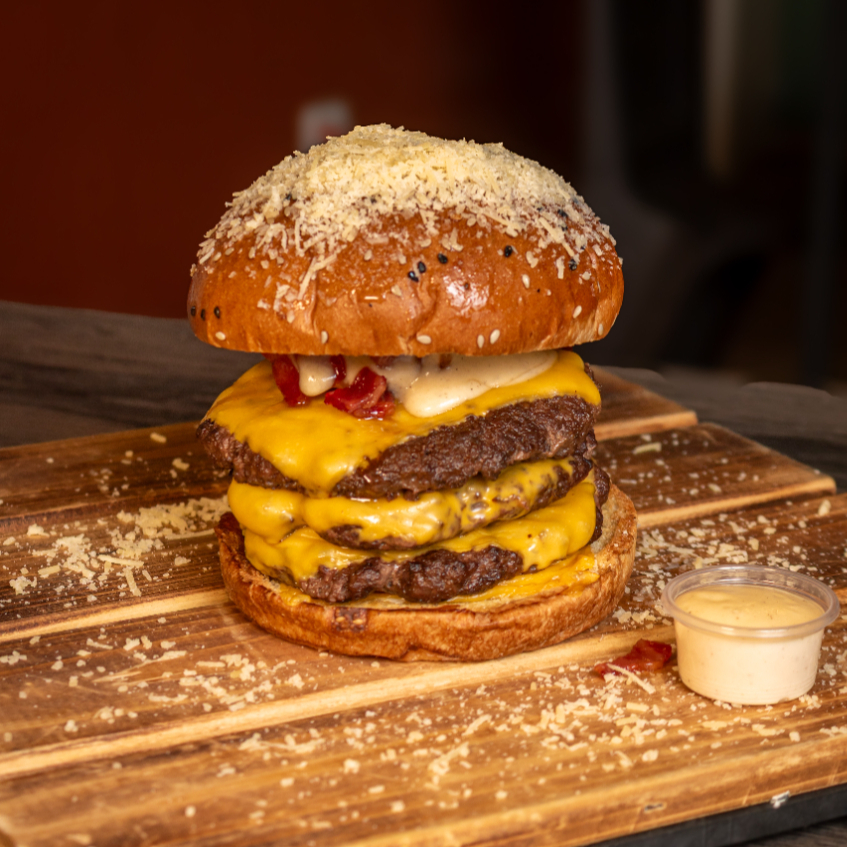 Pan brioche,carne angus certificada,triple queso chedar fundido,tocineta caramelizada,lechuga crespa,lluvia de parmesano