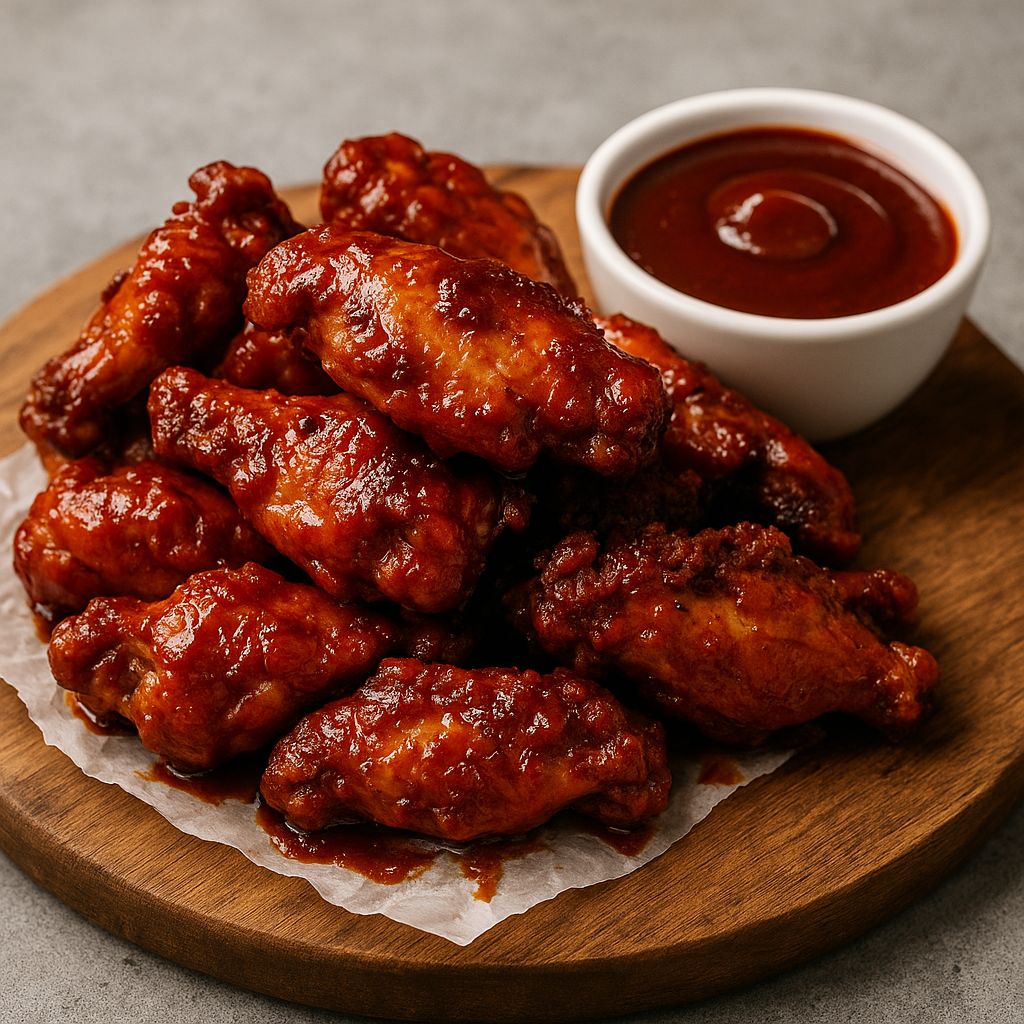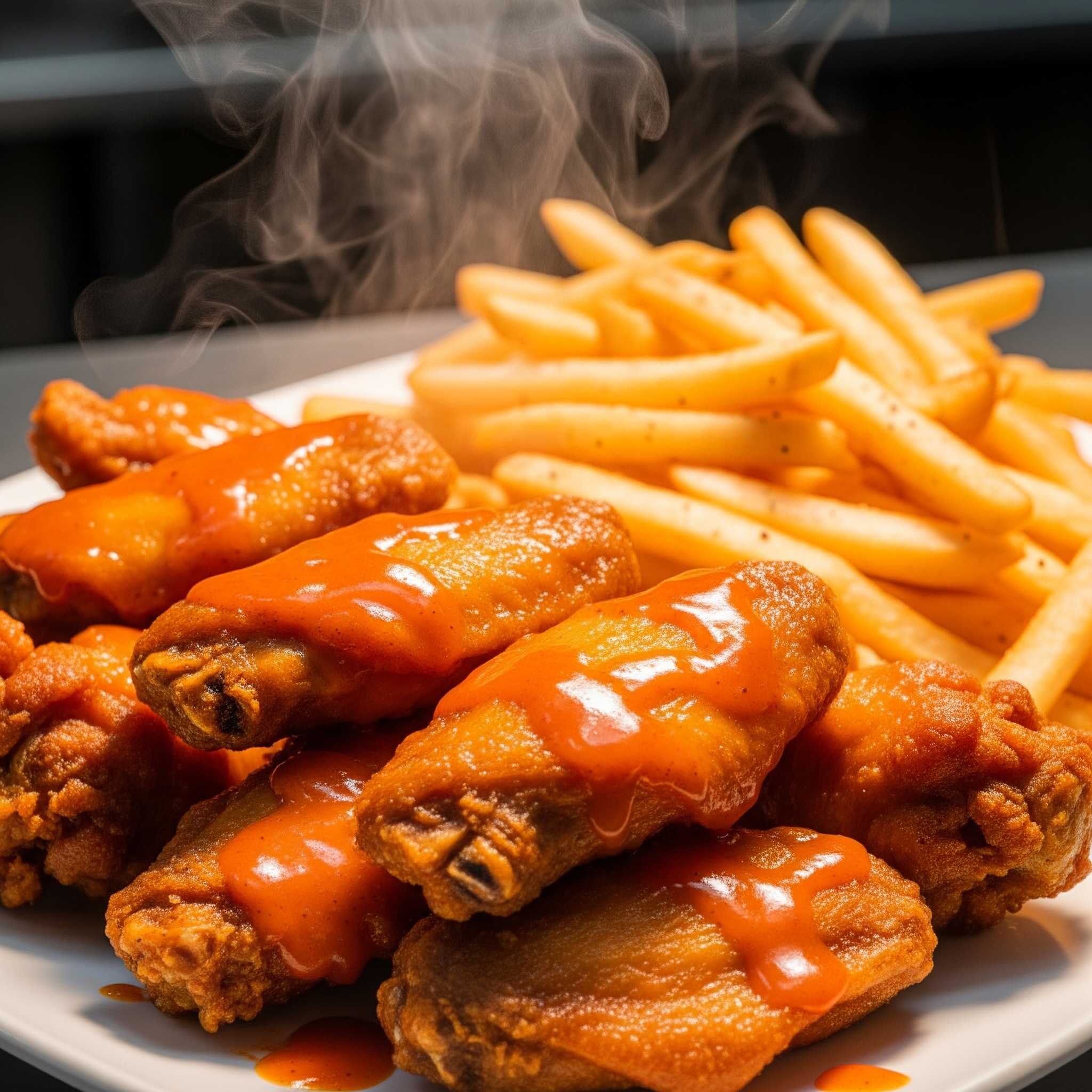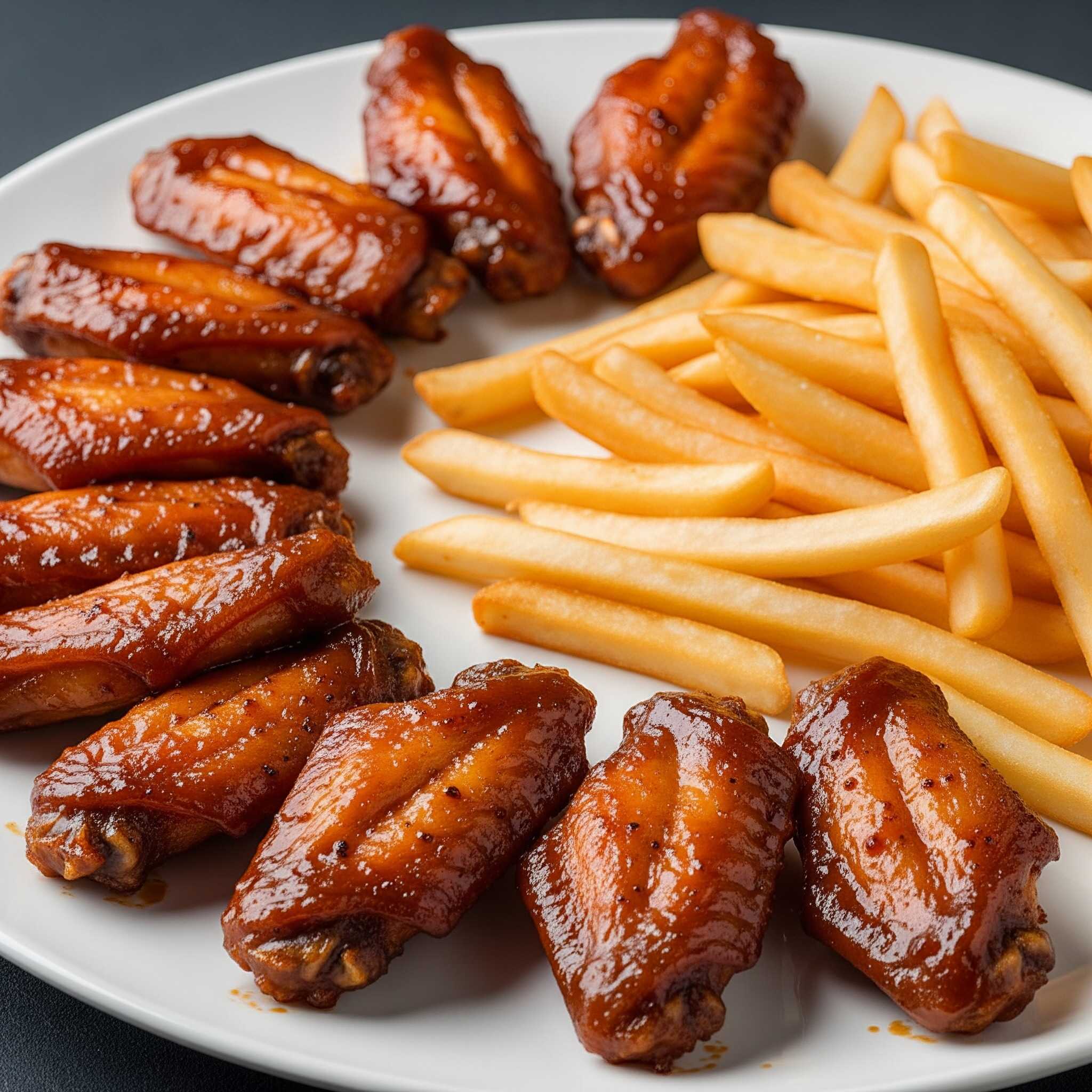 6 Alitas con salsa a elección acompañas de papas a la francesa.
