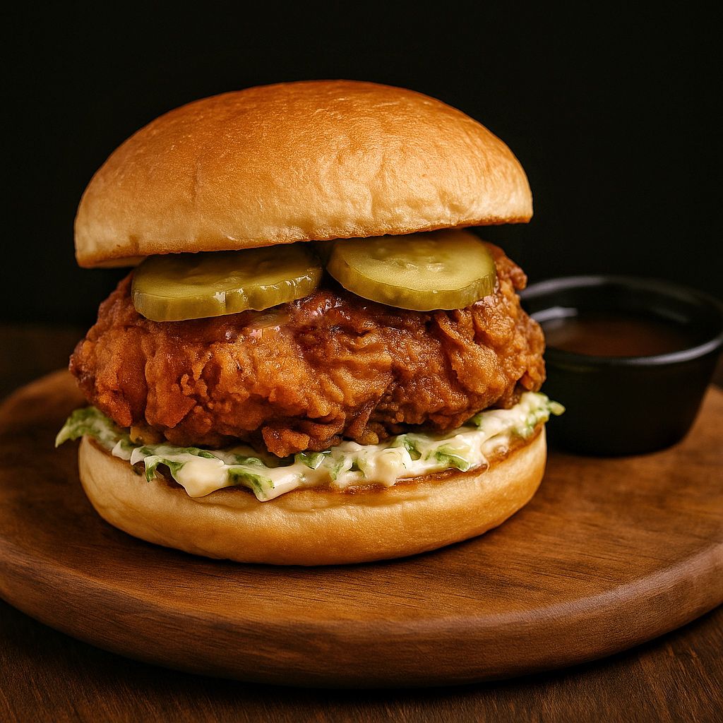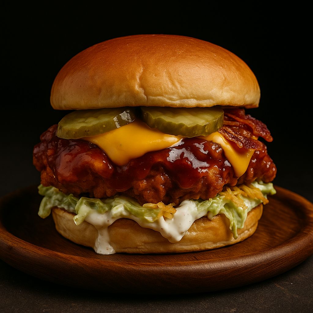 Churrasco de pollo apanado bañado en salsa BBQ, queso Cheddar, pepinillos, mayonesa de humo, entre un pan campesino artesanal.
