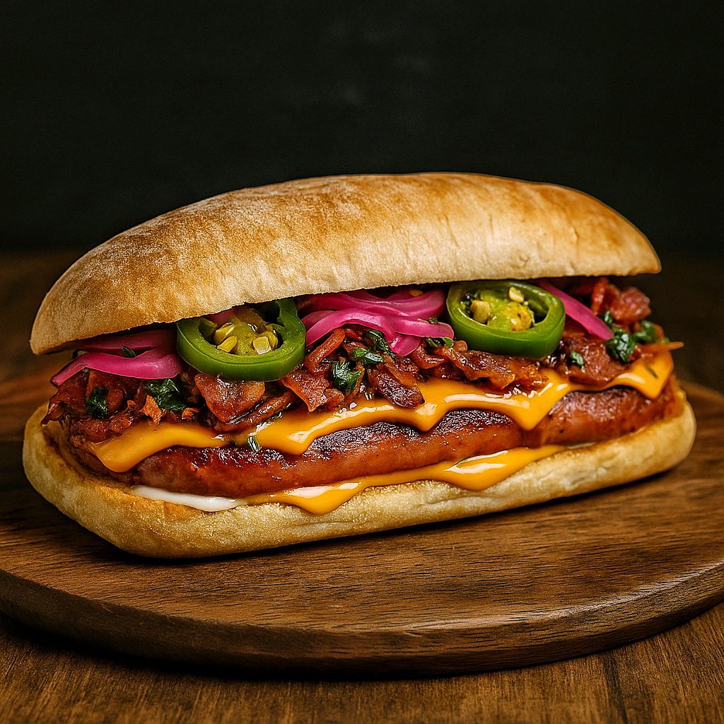 Chorizo de jalapeño más cheddar, tocineta ahumada, acompañado de queso cheddar, cebolla encurtida, mayonesa y chimichurri clásico entre un pan ciabatta.