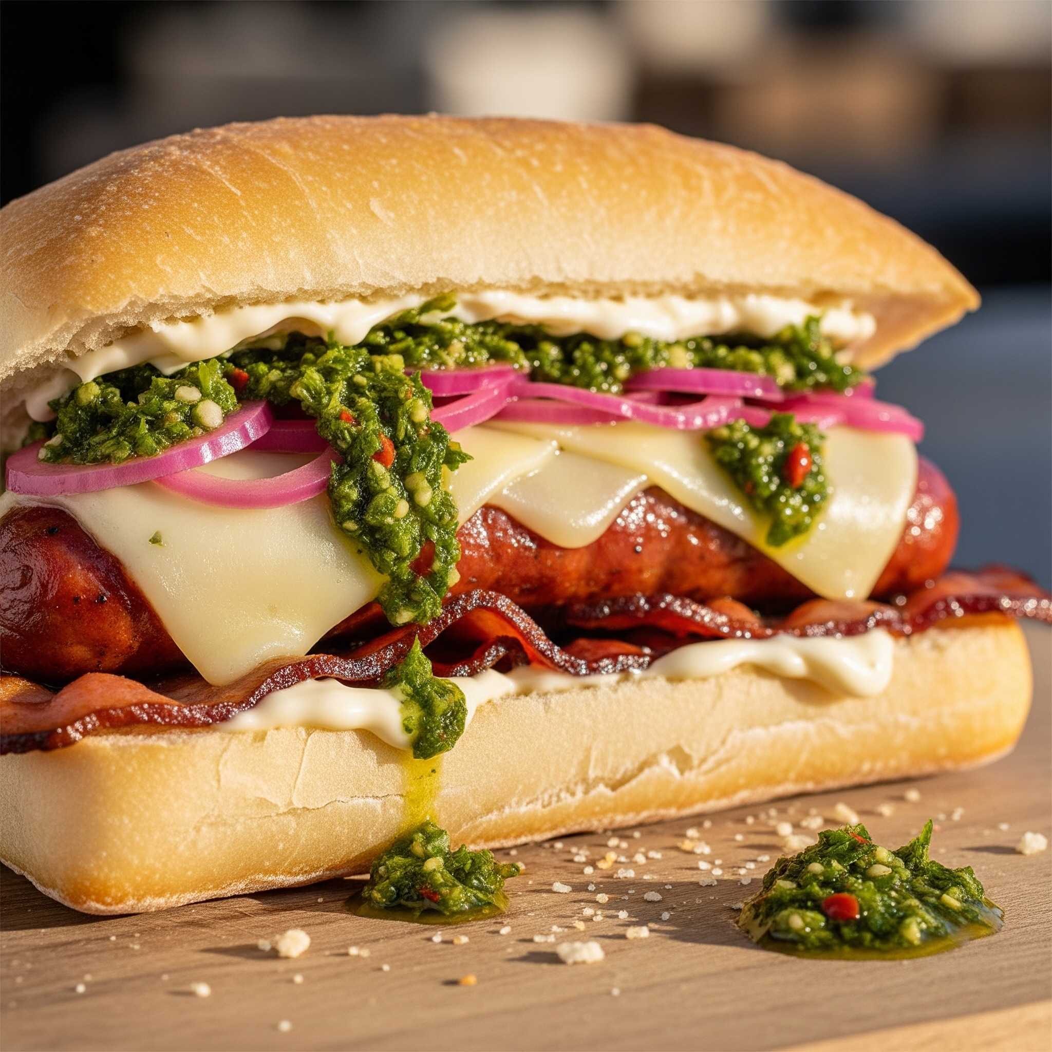 Chorizo argentino acompañado de tocineta ahumada, queso provolone, chimichurri clasico, cebolla encurtida, mayonesa entre un pan ciabatta.