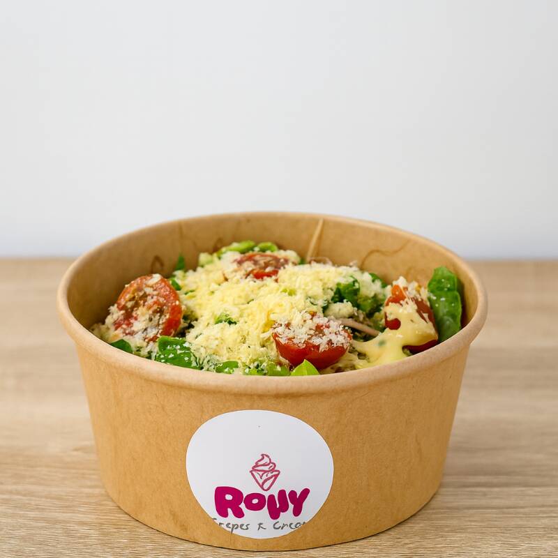 Crepa cortada en tiras, carne o pollo desmechado, tomate cherry, lechuga, maicitos, aguacate, queso parmesano, salsa ranch o ajo