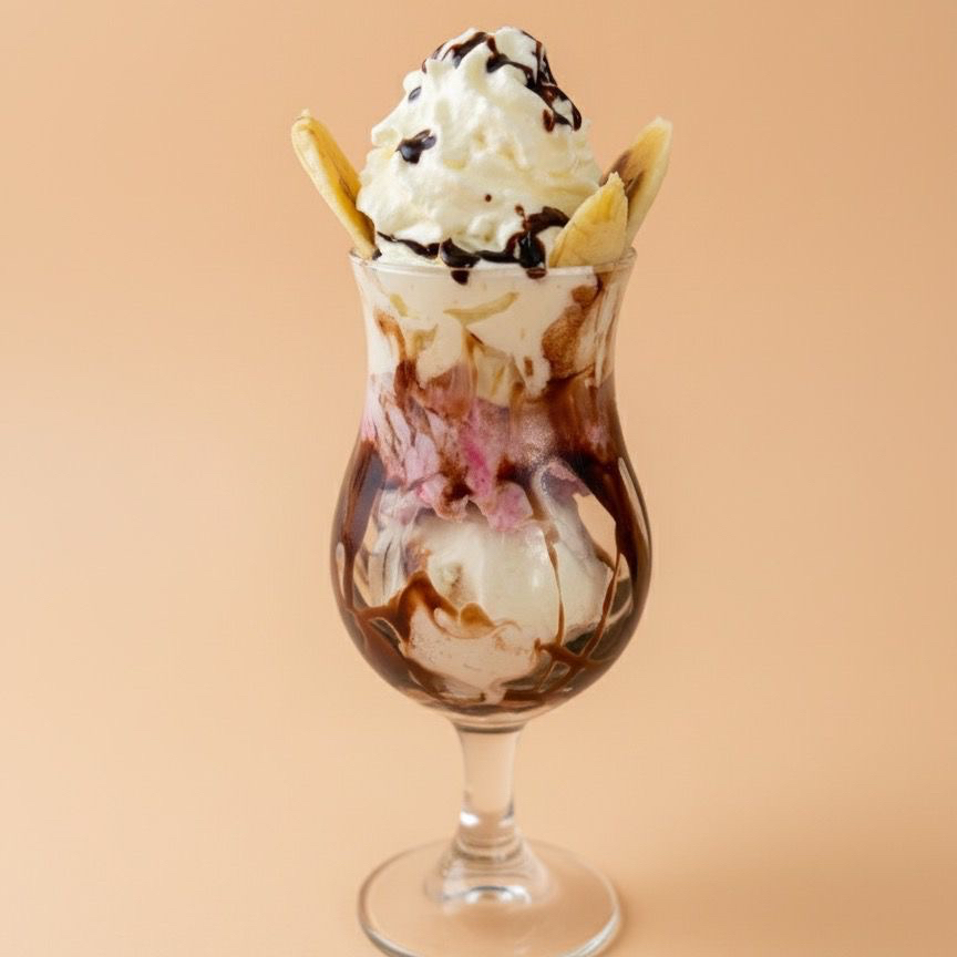 Salsa, trozos de banano, dos bolas de helado, crema chantilly