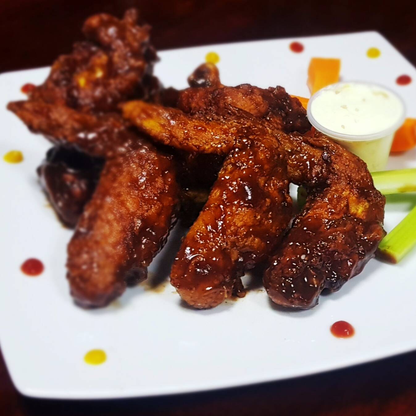Deliciosas alitas de pollo crocantes al estilo americano, bañadas en salsa de su elección y acompañadas de una cremosa salsa (sour cream), palmitos de zanahoria y apio fresco.