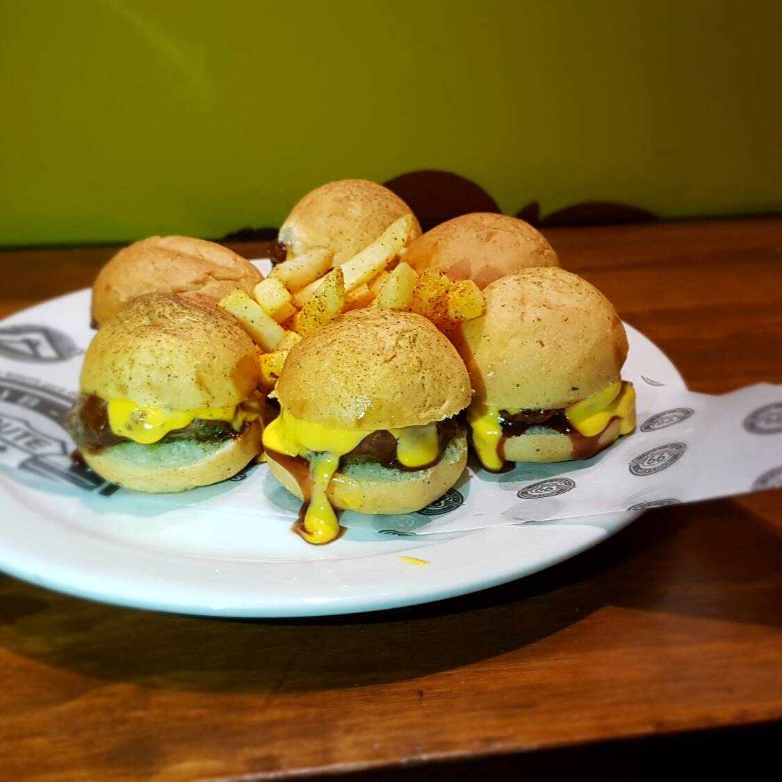 Deliciosas mini hamburguesas bañadas en queso cheddar y salsa BBQ, acompañadas de papas a la francesa.