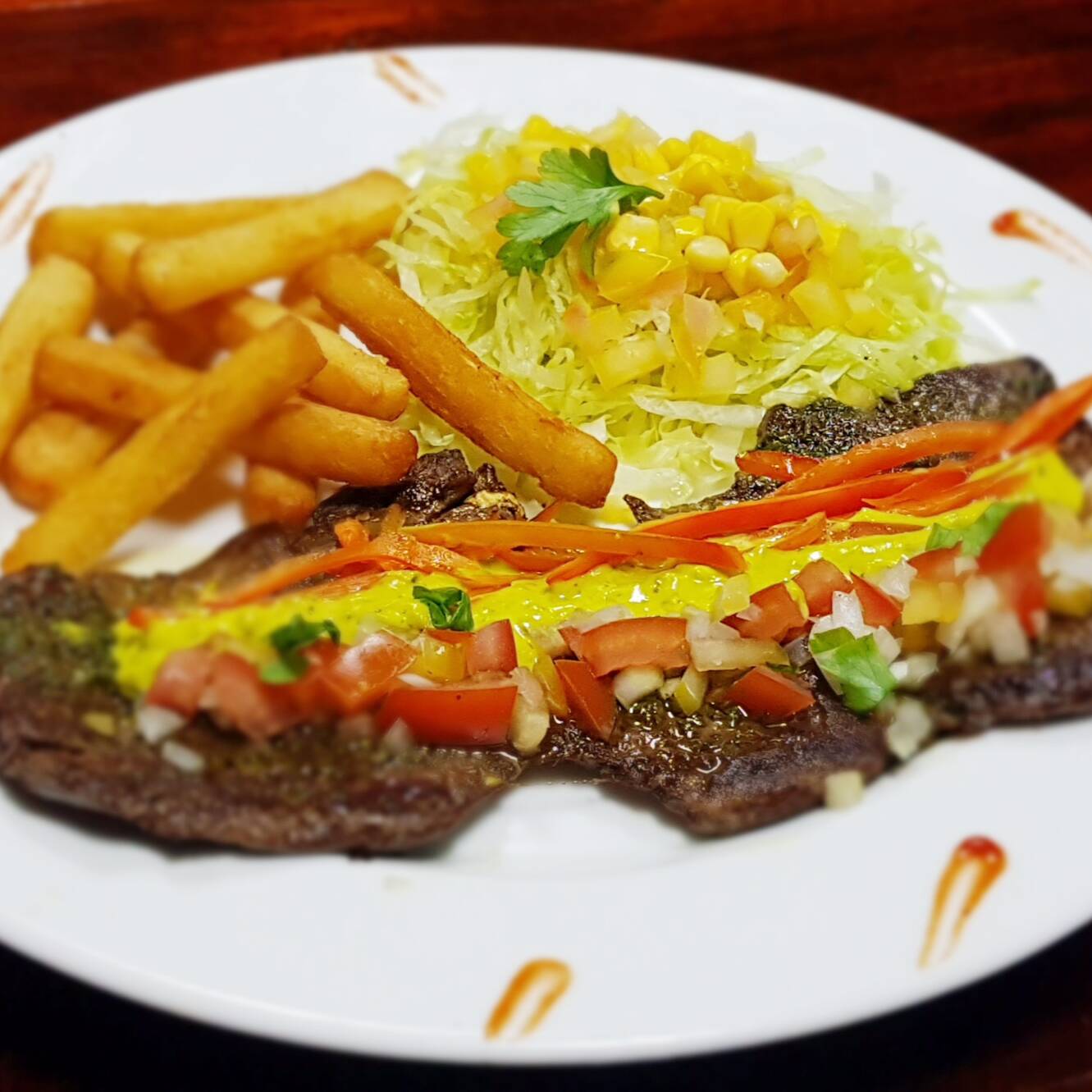 Jugoso lomo de res de 250gr bañado en salsa de buffalo, guacamole, pico de gallo, pimentón, jalapeños, acompañado de papas a la francesa y ensalada de la casa