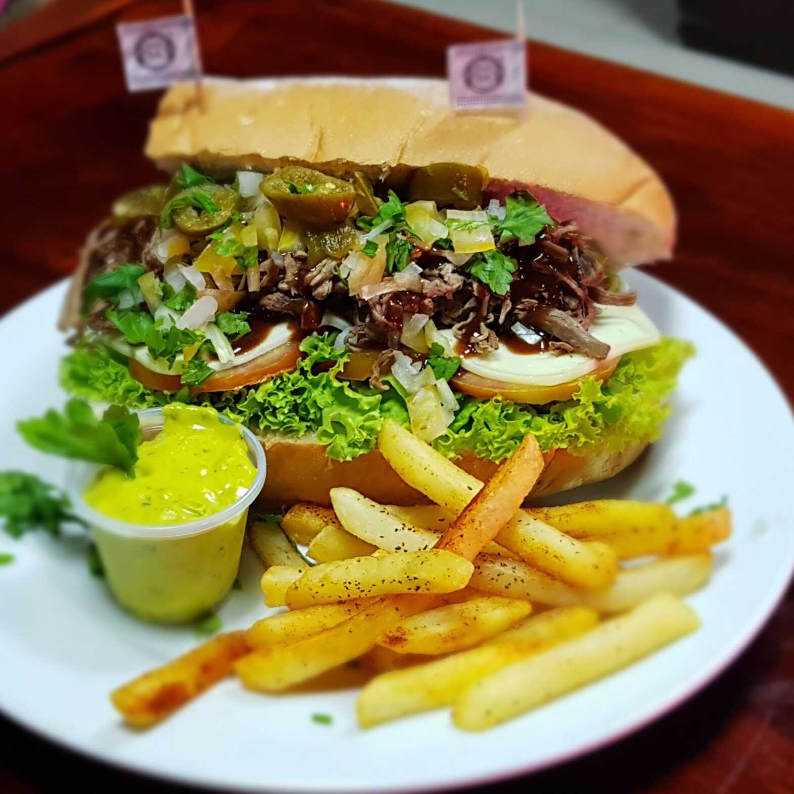 Delicioso sándwich al estilo roast beef, lonjas de lomo viche salteado con salsa de soya, vino tinto con queso mozzarella, lechuga crespa y tomate acompañado de papas a la francesa.