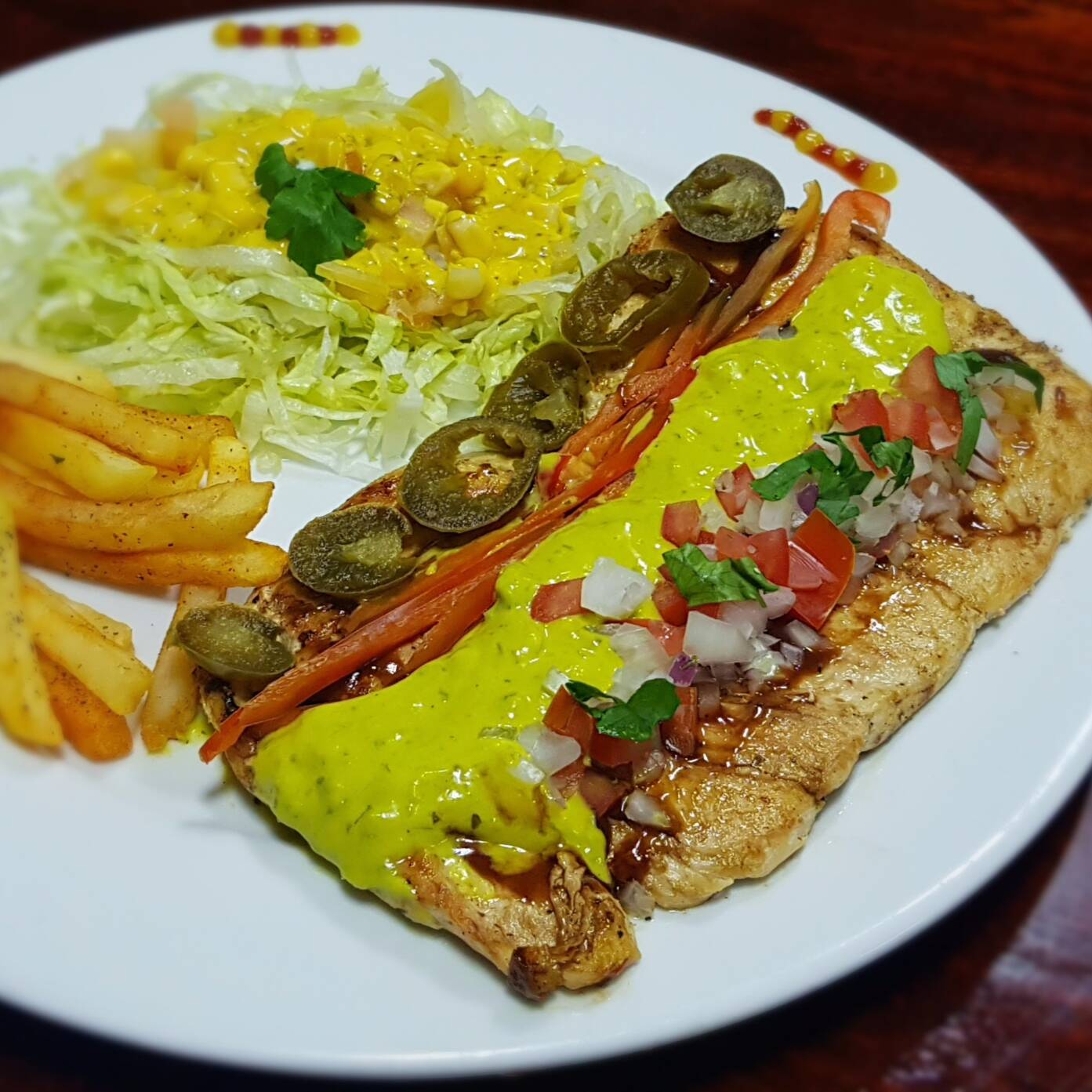 Jugoso filete de pollo de 250gr, bañado en salsa de buffalo, guacamole, pico de gallo, pimentón, jalapeños, acompañado de papas a la francesa y ensalada de la casa