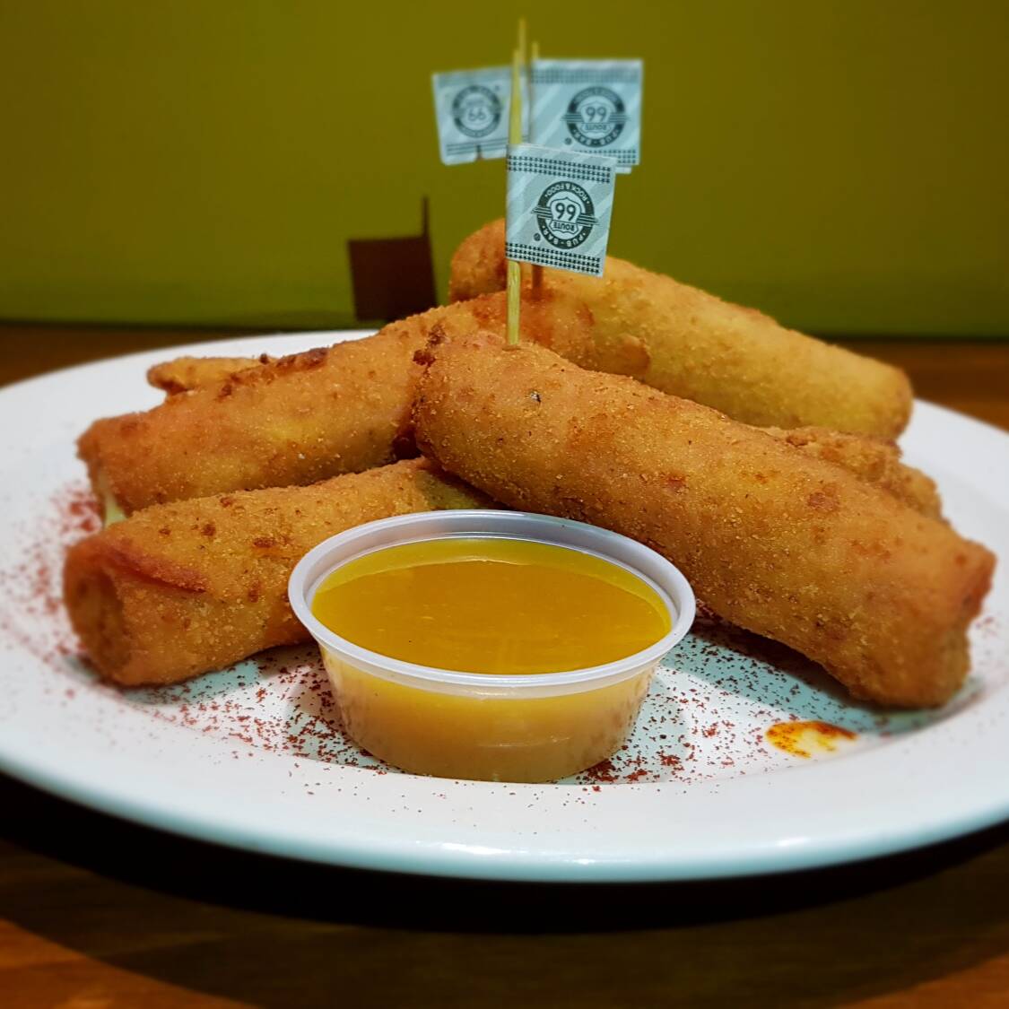 Apetitosos deditos de queso al estilo americano envueltos en una fina lonja de jamón y apanados, acompañados de miel mostaza.
