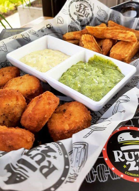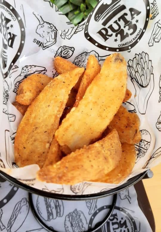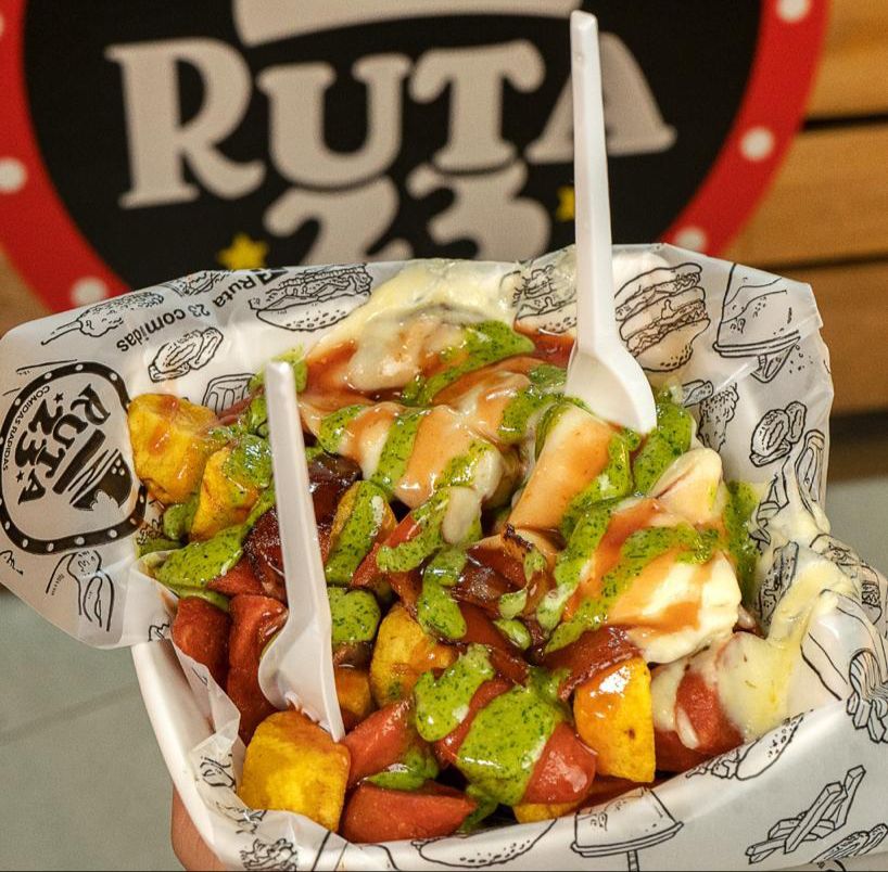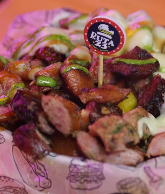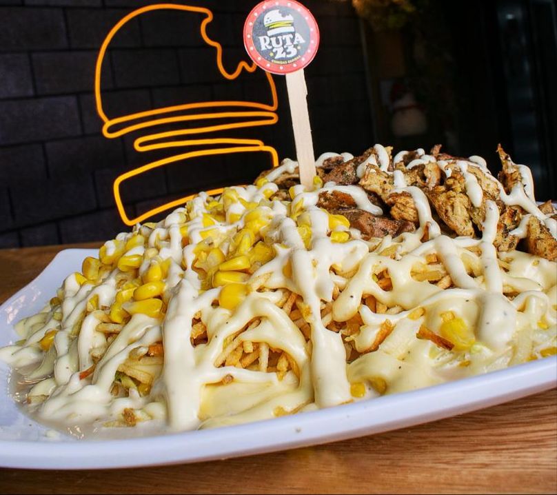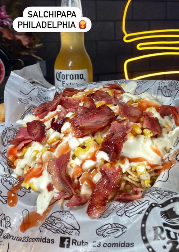 papa amarilla, salchicha ahumada, doble queso mozzarella, queso philadelphia, ripio, maiz, tocineta, tomate, salsa de ajo.