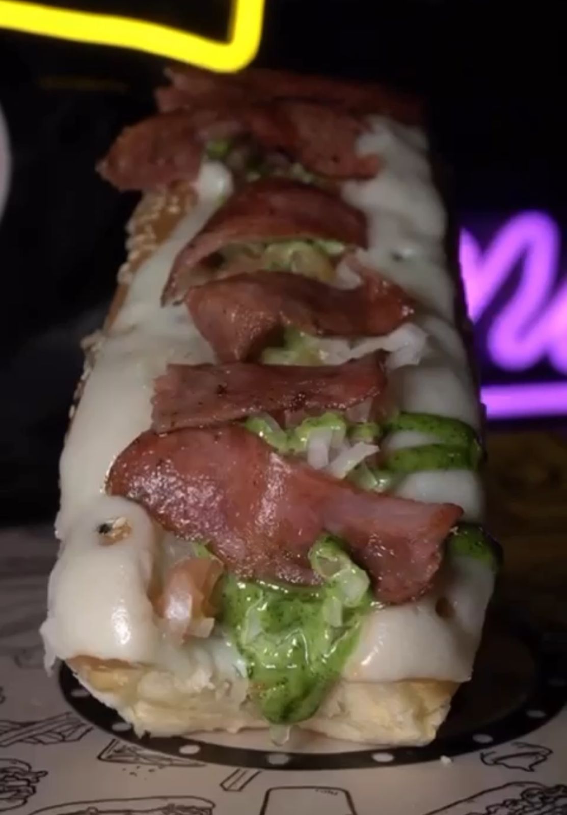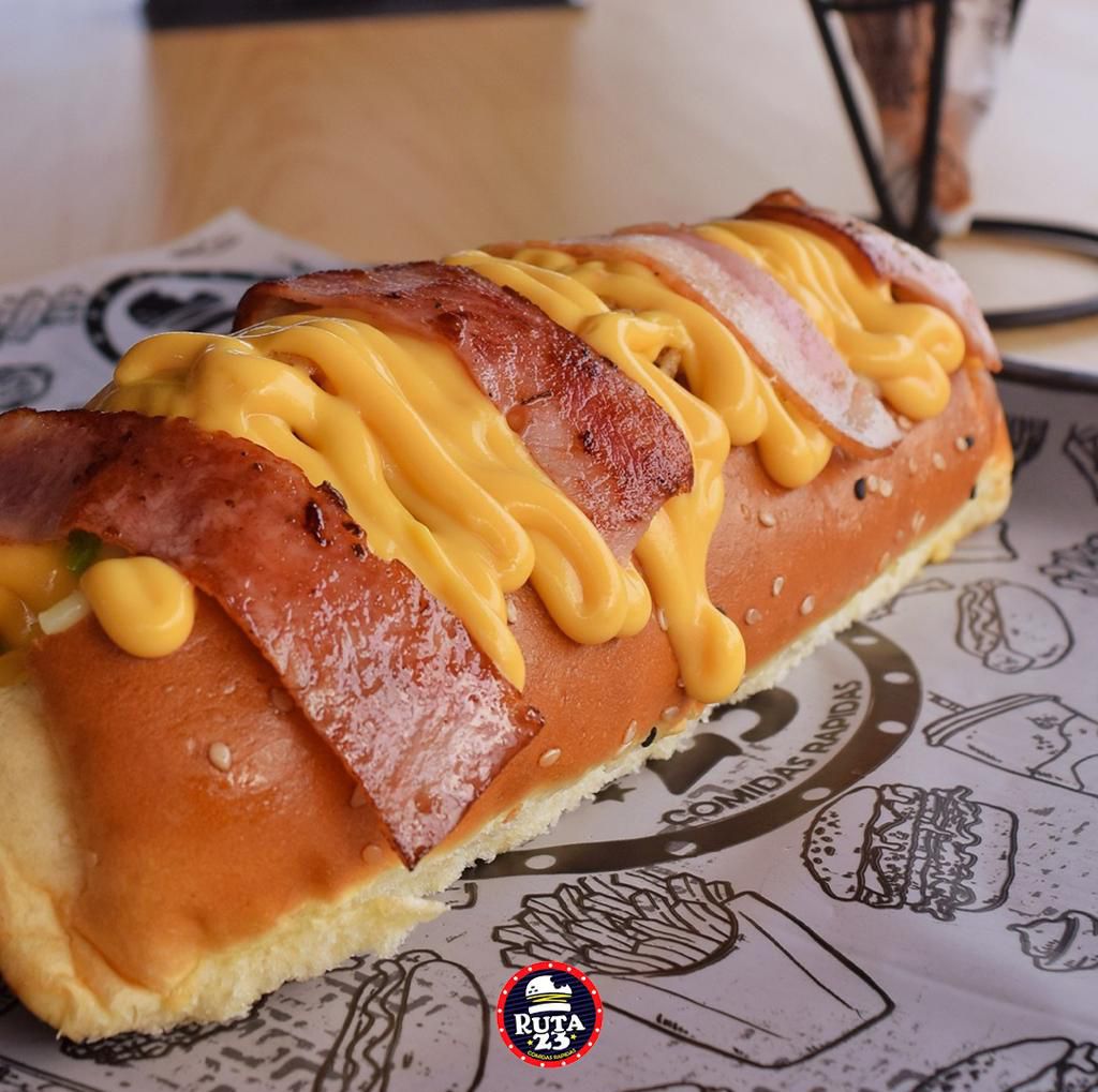 pan brioche, salchicha americana, maduro cortado, maicitos, queso mozarella, queso americano, tocineta y salsa de la casa