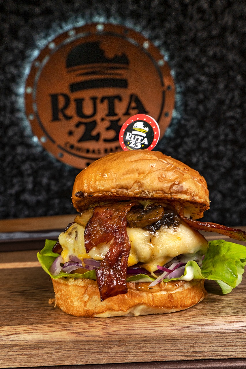 pan brioche, carne angus, cebolla morada, queso mozarella, queso americano, tocineta, lechuga y salsa de tomate