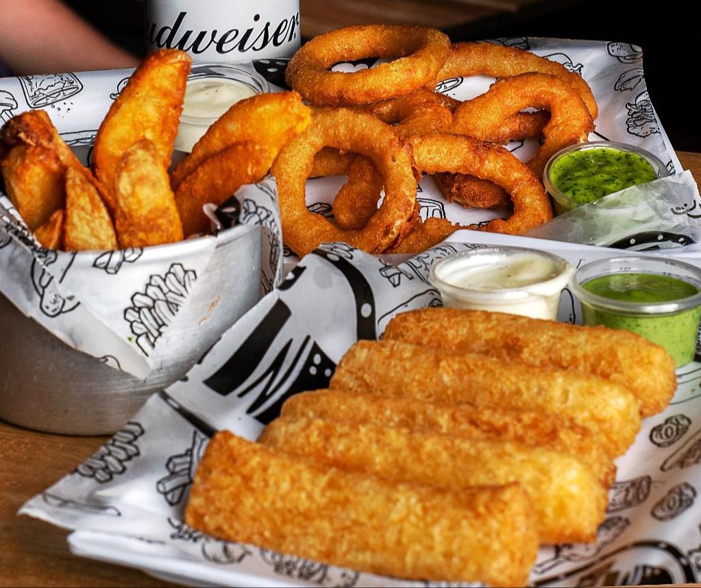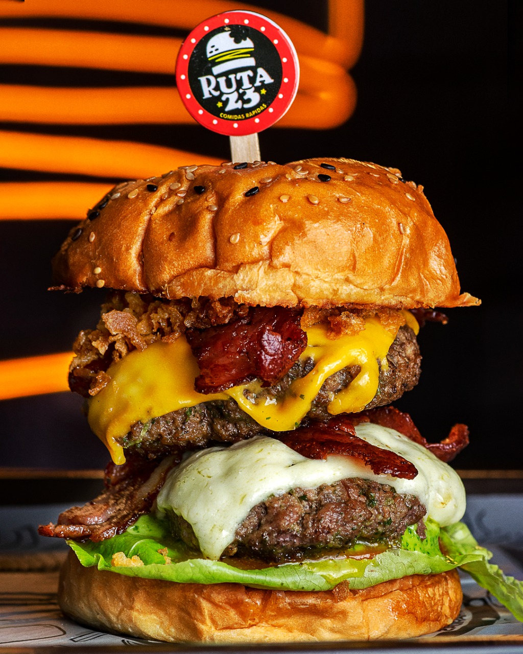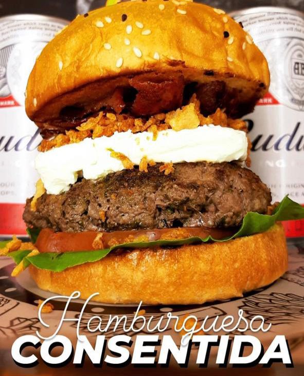 pan brioche, doble carne de 150gr 100% angus, coronada con cebolla crispy, doble queso mozzarella, doble queso americano, doble tocineta, vegetales frescos, miel mostaza y salsa de la casa