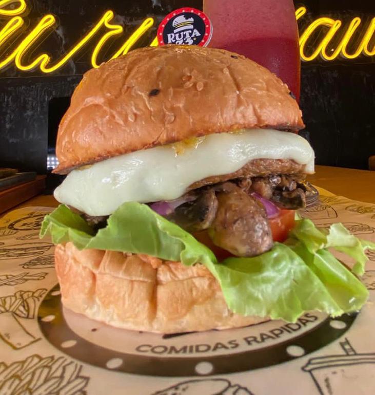 pan brioche, carne a base de proteina de soya, trigo, cebolla, condimentos, lechuga, tomate, champiñones, maduro calado y salsa de la casa