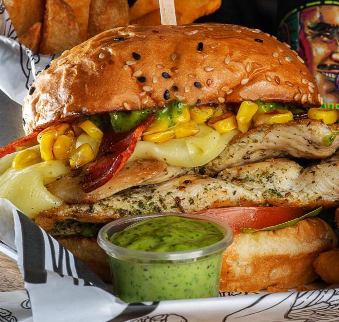 pan brioche, pollo asado, queso, mozarella, maicitos, pechuga a la plancha , lechuga, tomate y tocineta