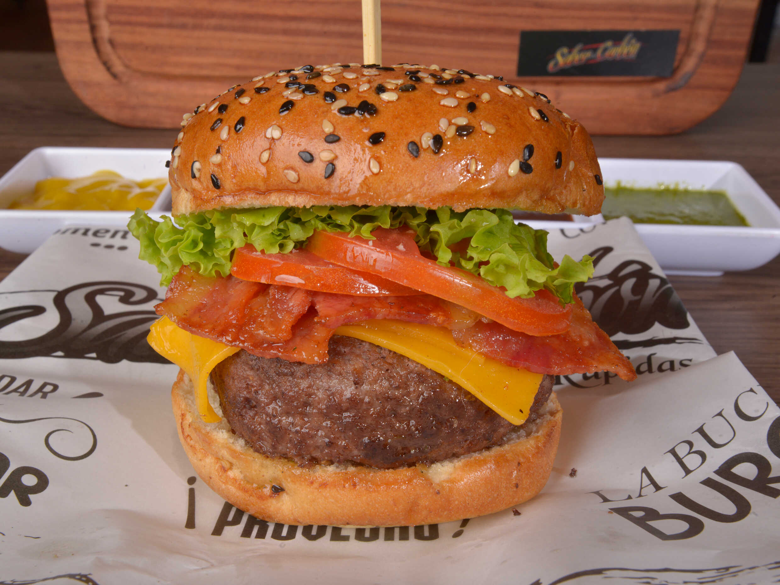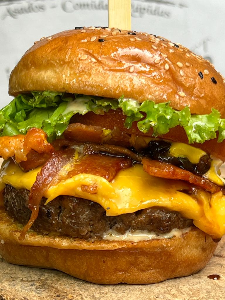 Pan artesanal, 200 gr carne angus, queso mozzarella, queso cheddar, tomate, tocineta, lechuga, cebolla caramelizada y salsas de la casa.