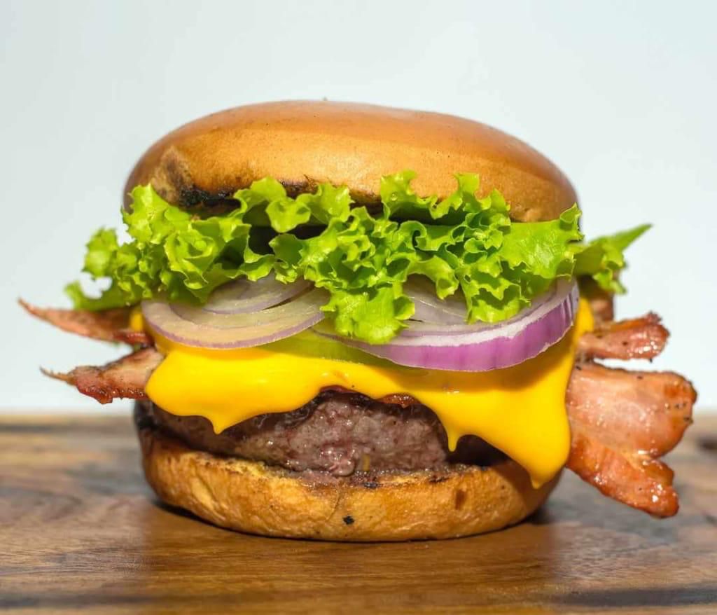 Pan artesanal, ripio de papa, lechuga, carne la casa 150 gr, doble tocineta, triple queso mozzarella y tomate.