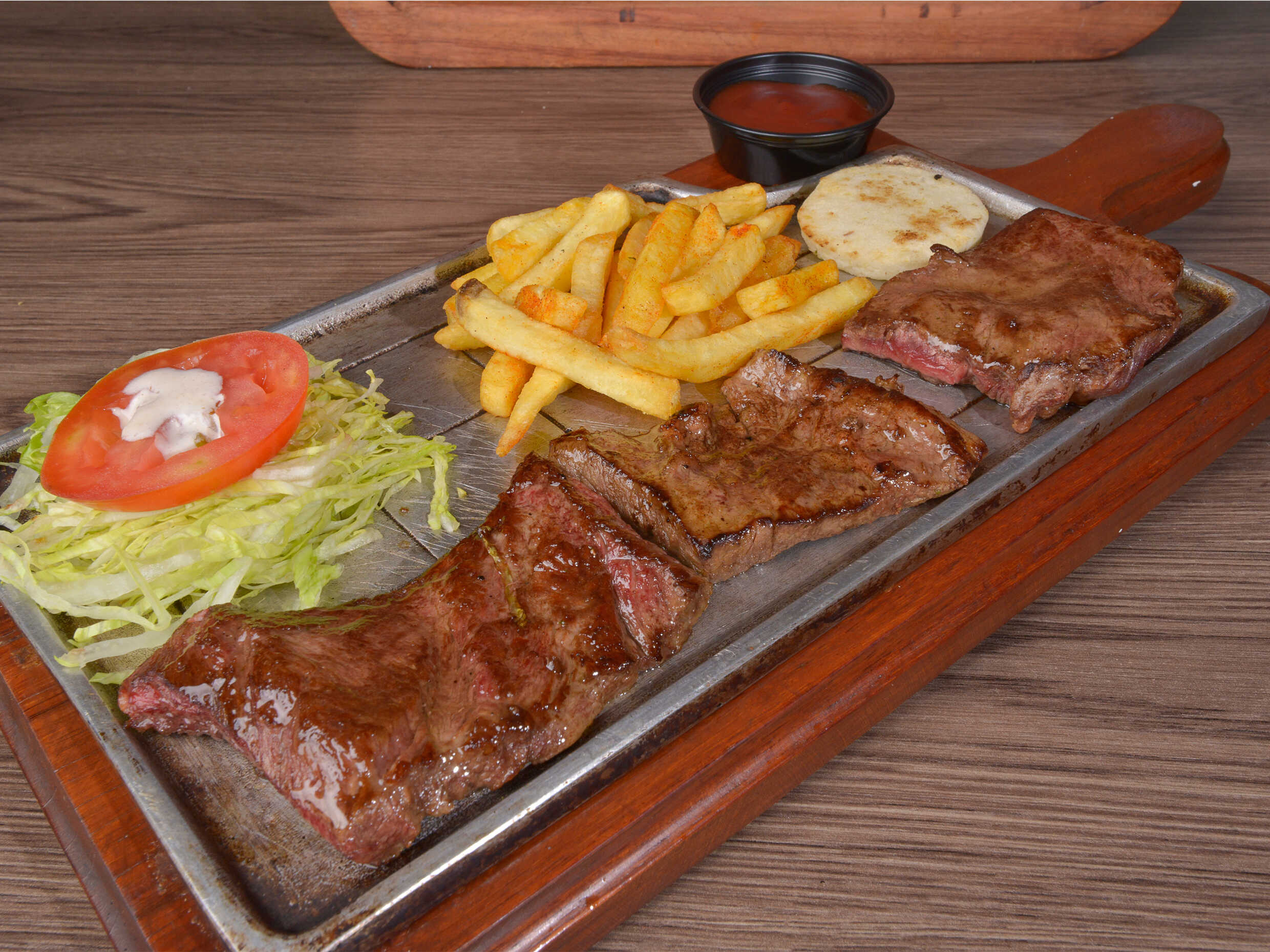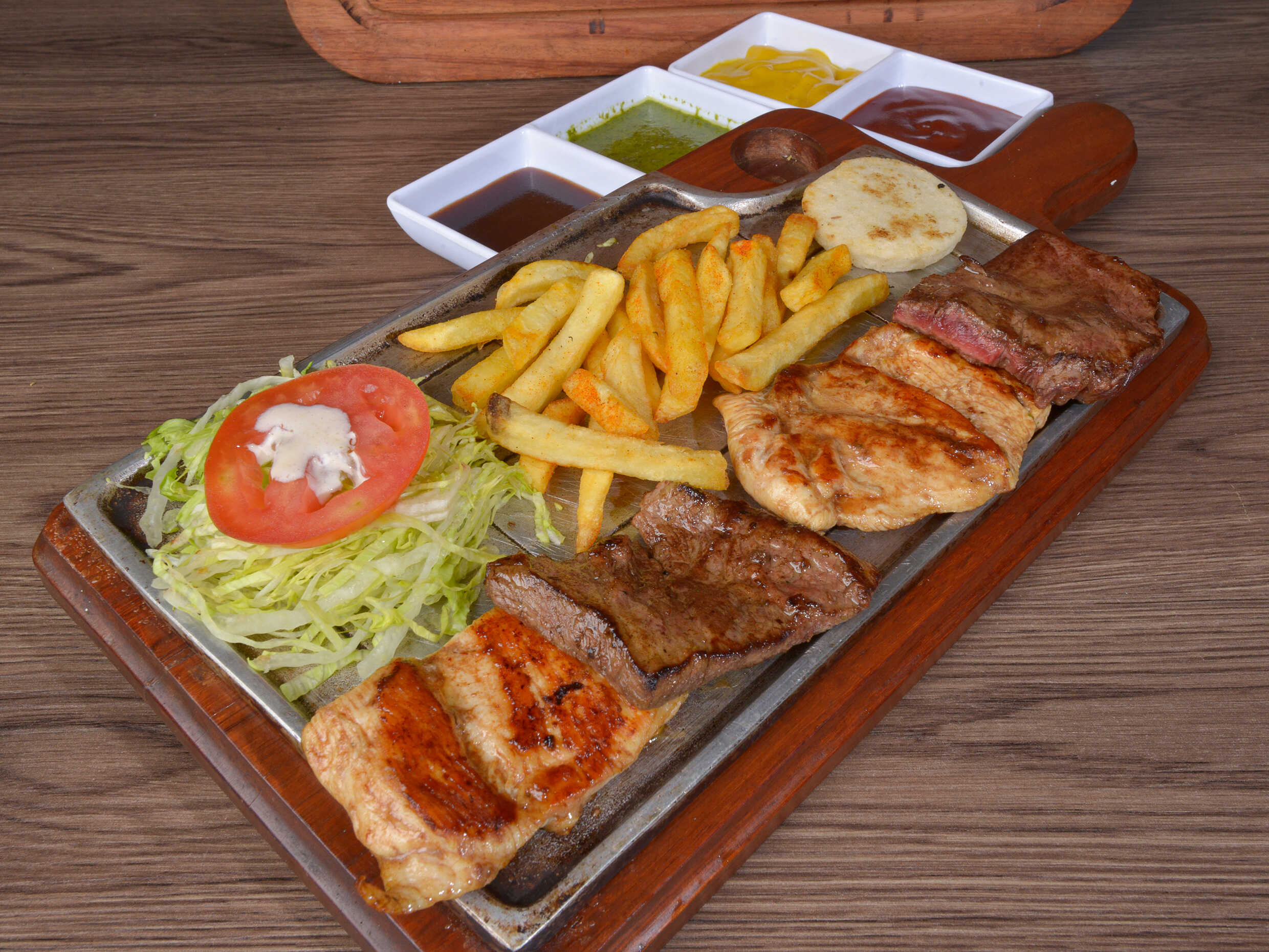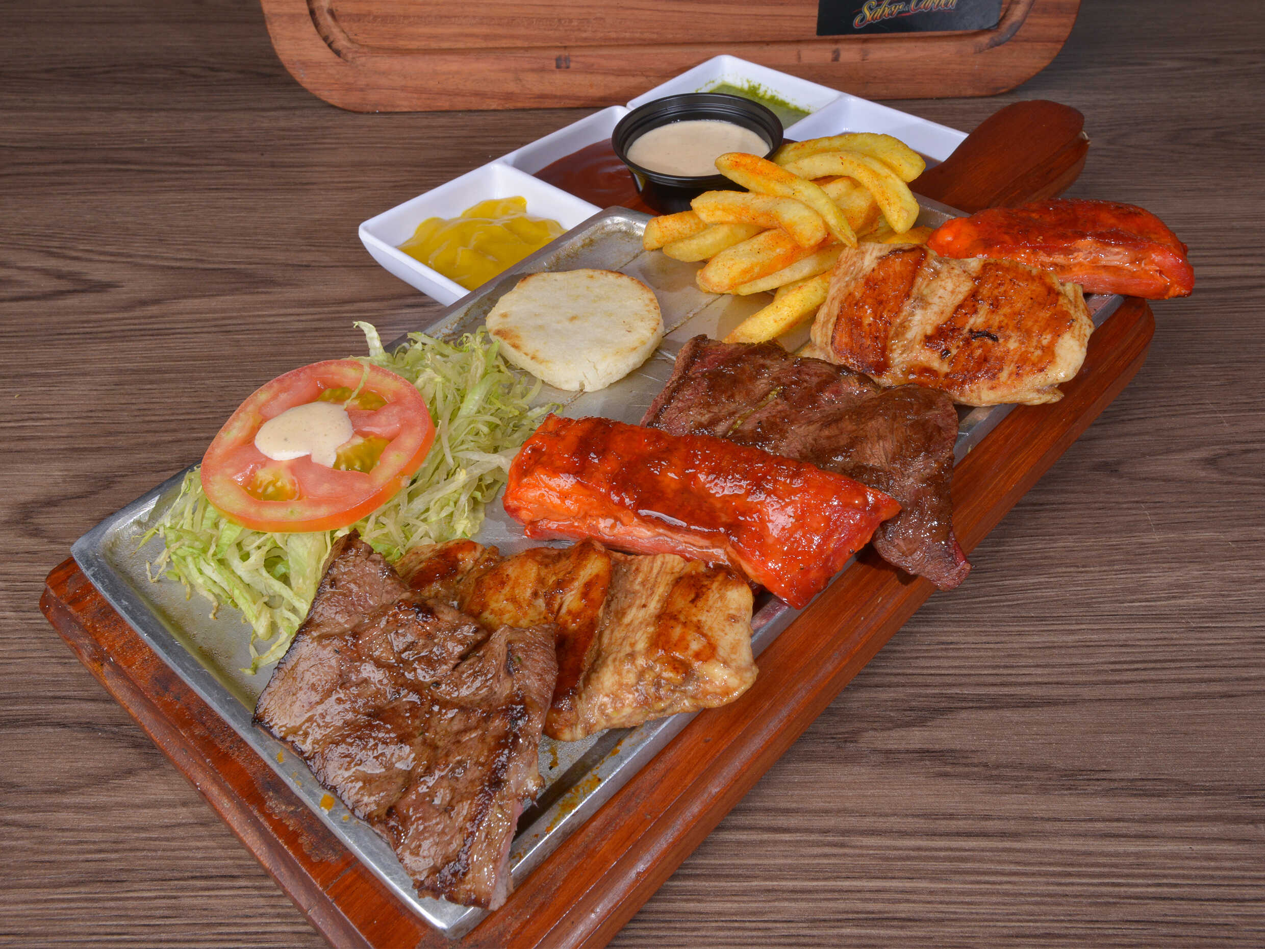 Carne, pollo, costilla ahumada, chorizo, ensalada de la casa, arepa papa al vapor y papa francesa.