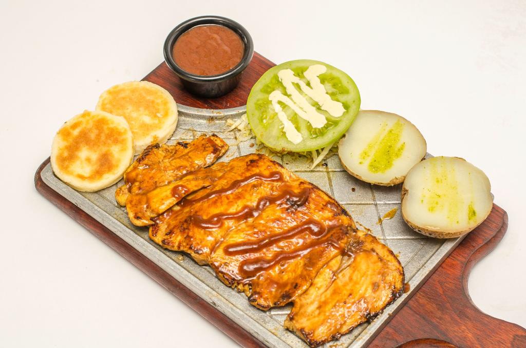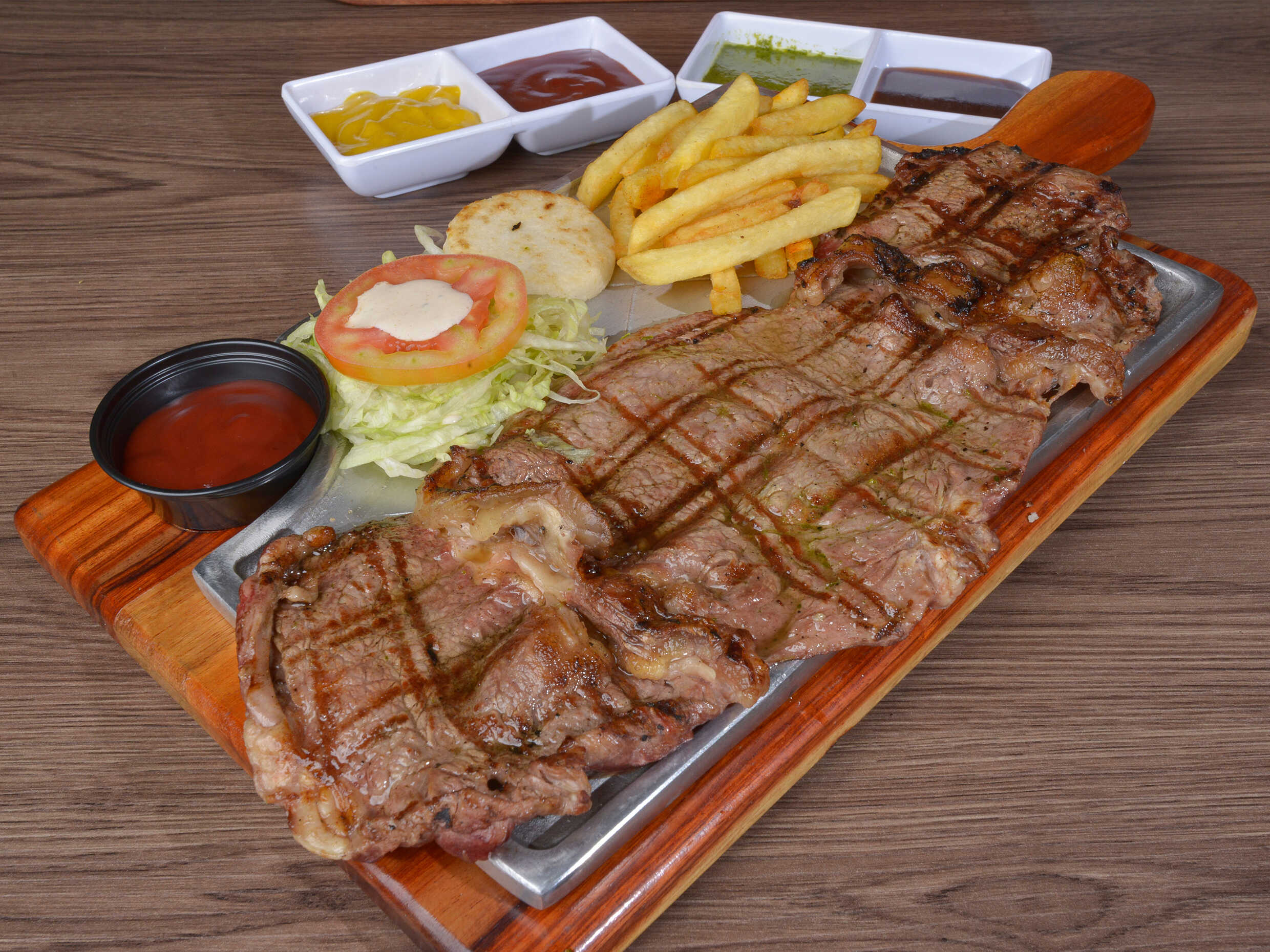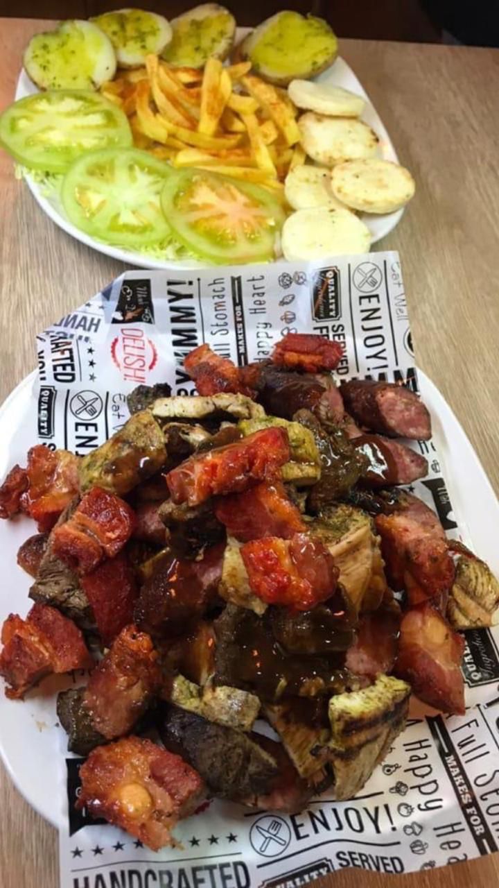 Carne, pollo, costilla ahumada, chorizo, ensalada de la casa, arepa papa al vapor y papa francesa.