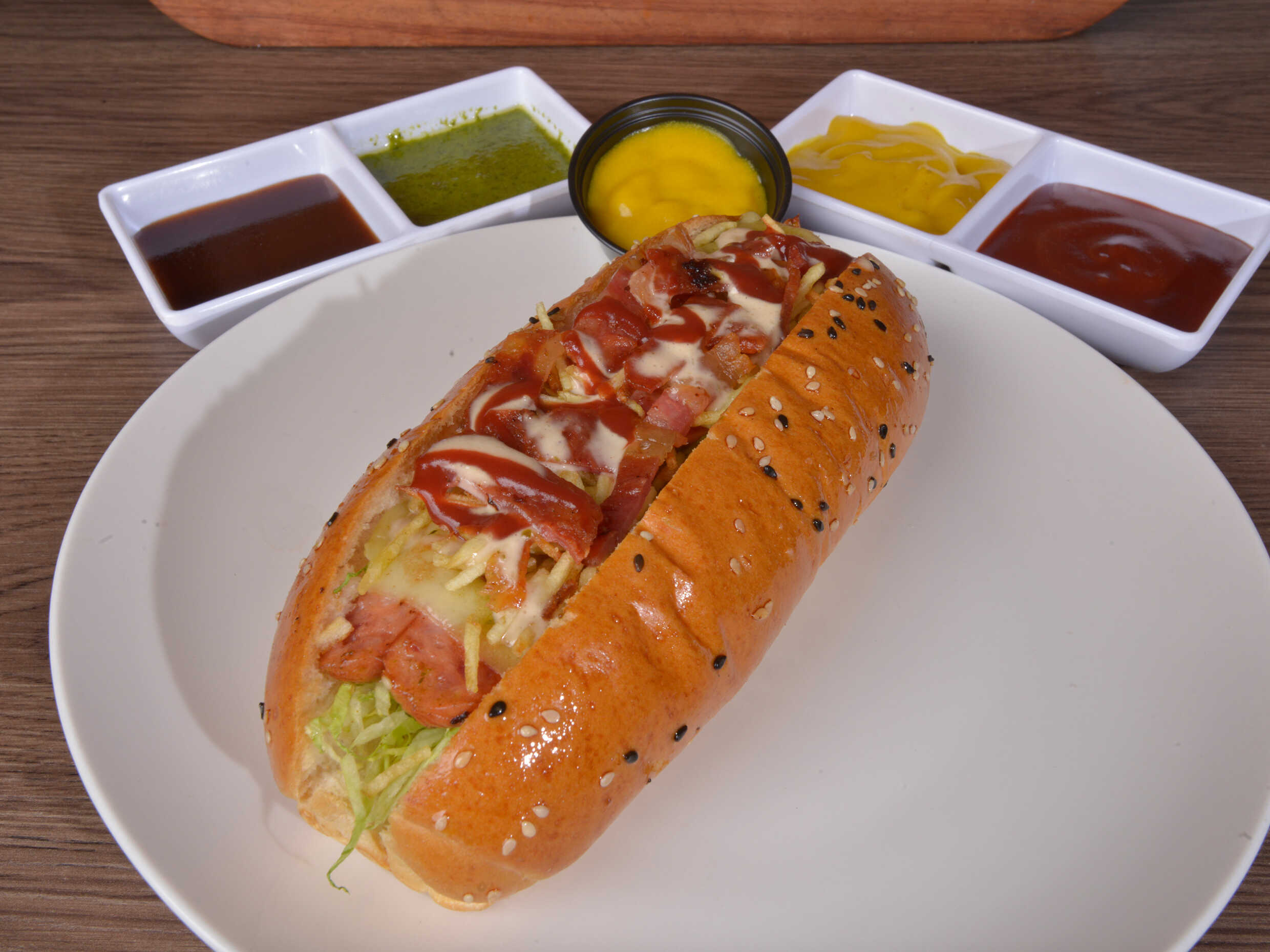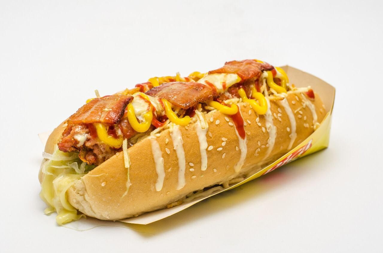 Pan ripio de papa, lechuga, salchicha suiza zenu, queso, tocineta y salsas de la casa.