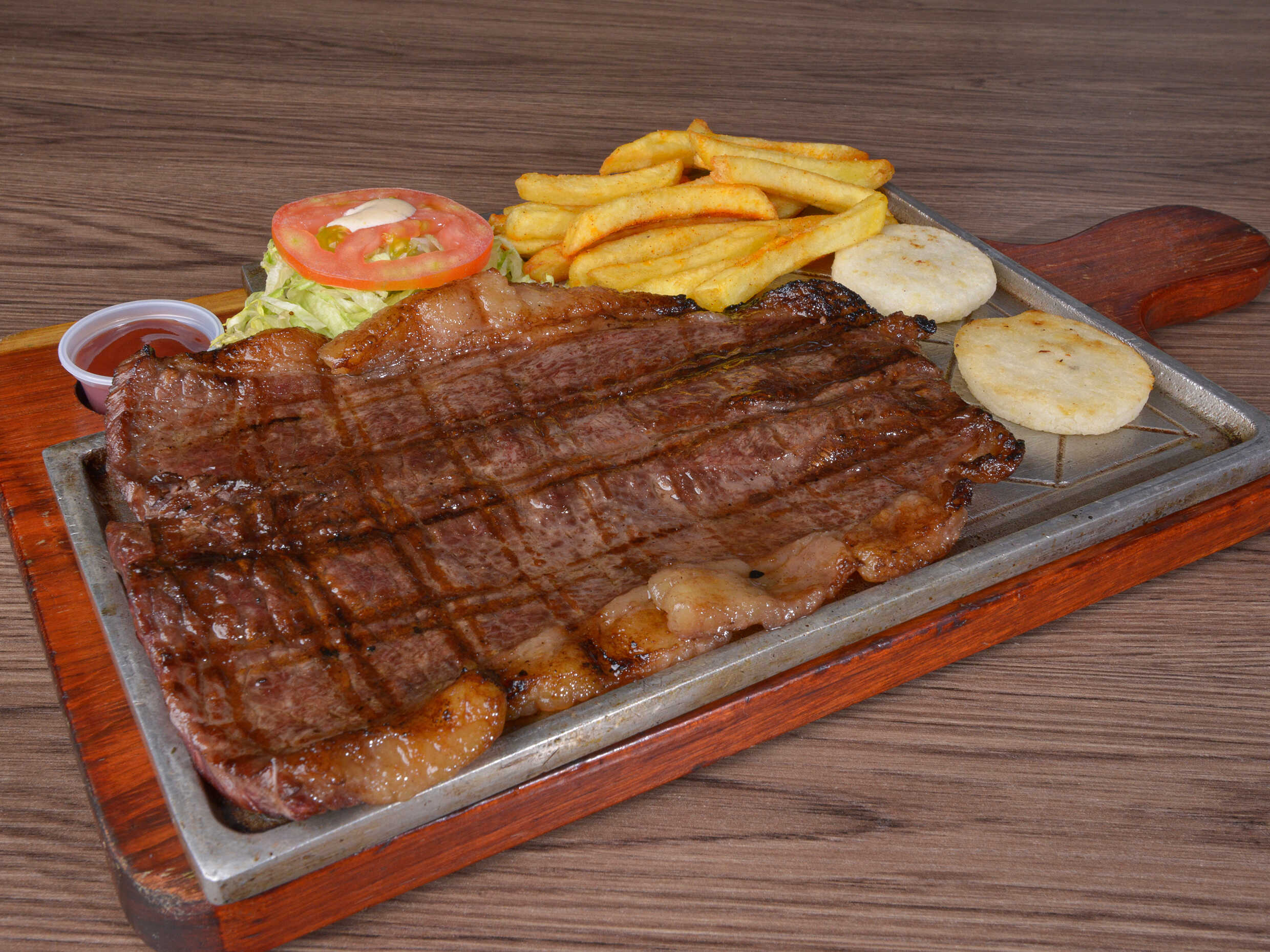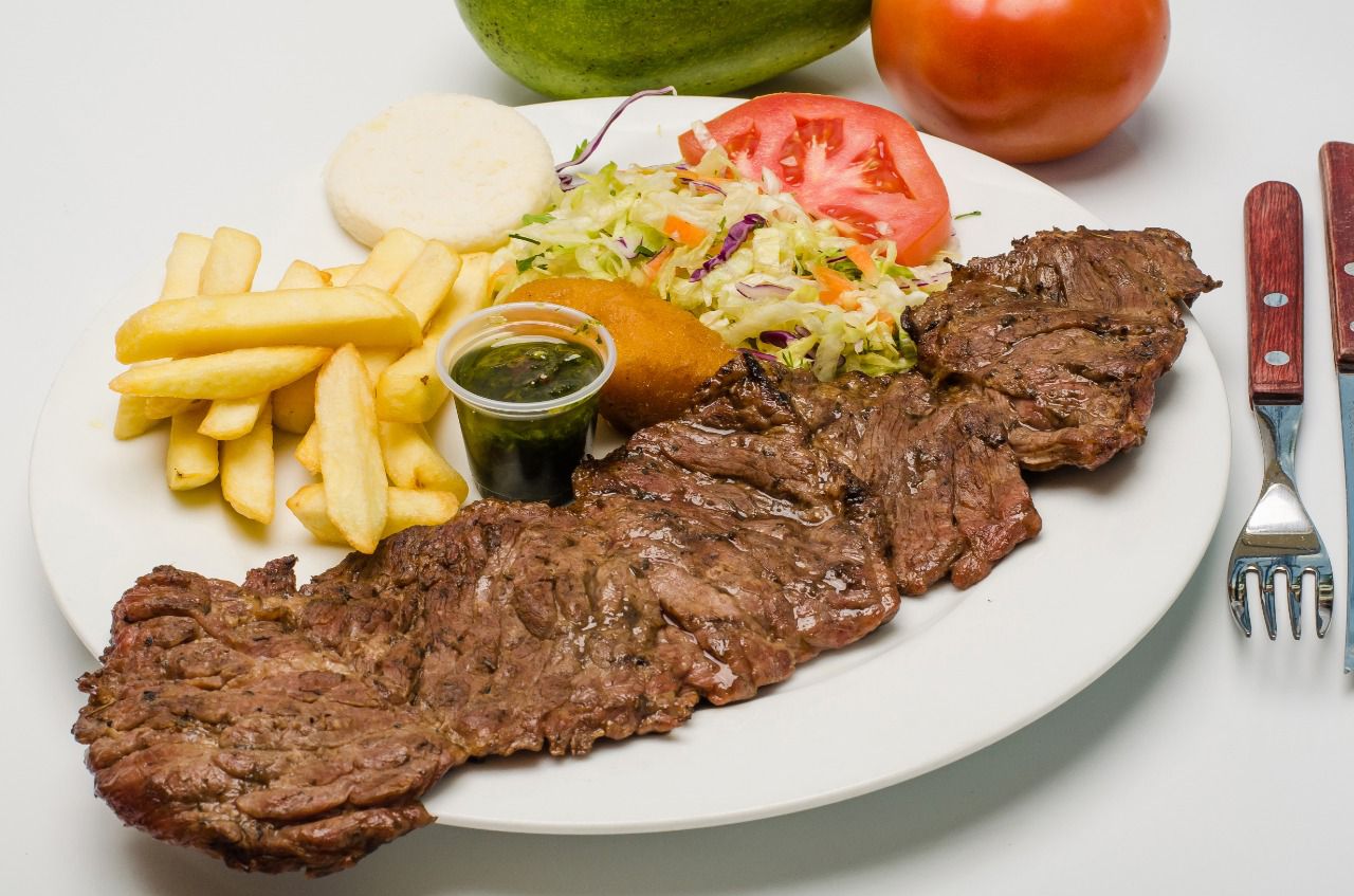 Res acompañado de papa a la francesa, arepa y ensalada de la casa.