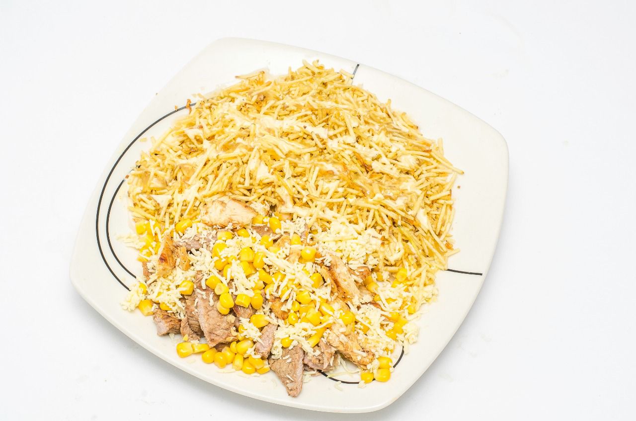 Base de lechuga, carne, pollo, maiz, queso vitafilado, salsa de la casa y ripio.