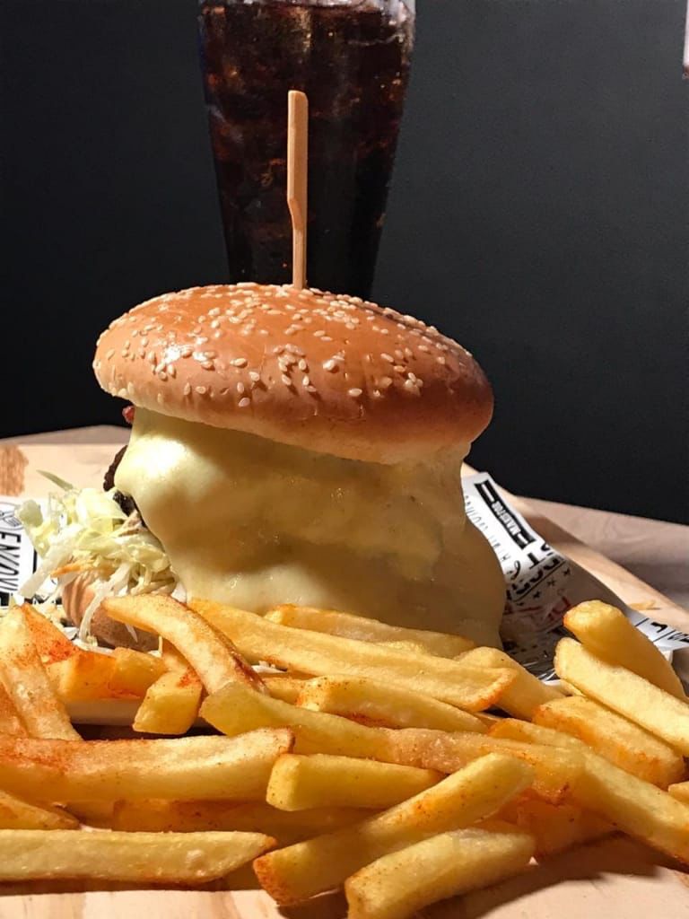 Pan, ripio de papa, lechuga, carne de res, tomate, queso blanco, salsas de la casa y acompañado con papas a la francesa.
