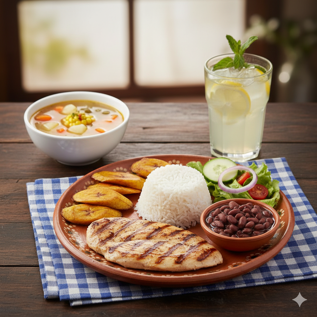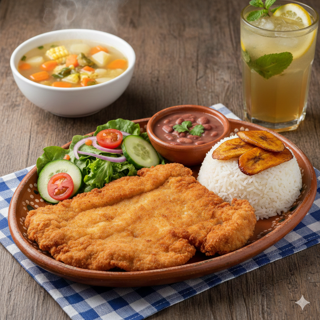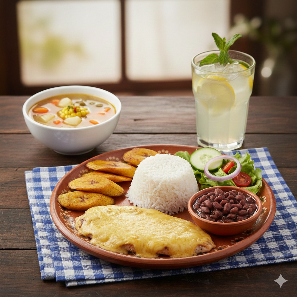 Acompañado de arroz, tajada, ensalada de la casa, principio a elección, sopa del día, limonada de la casa.