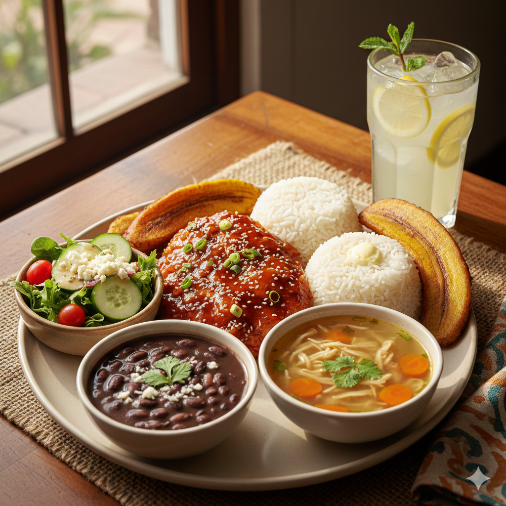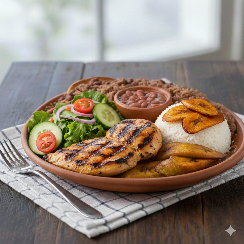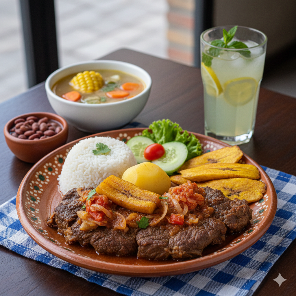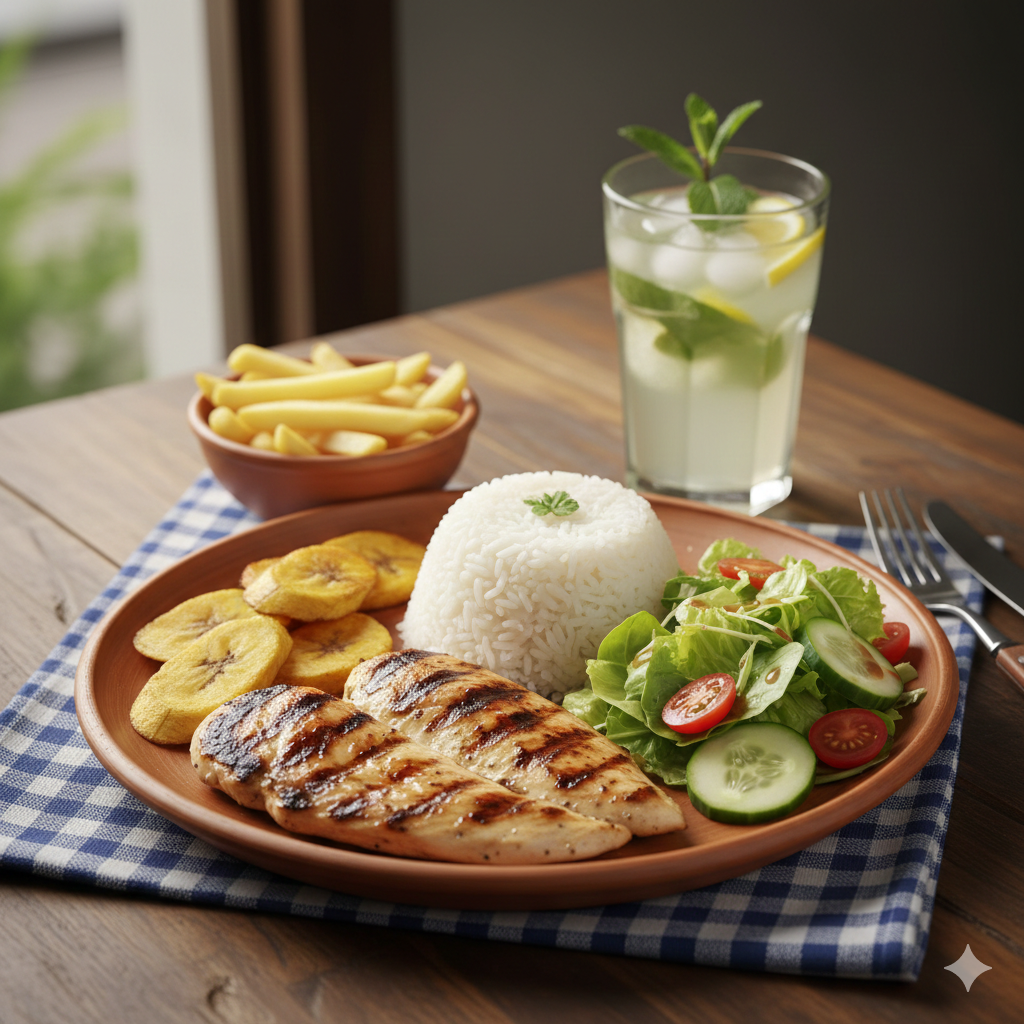 Acompañado de arroz, tajada, ensalada de la casa, principio a elección, sopa del día, limonada de la casa.