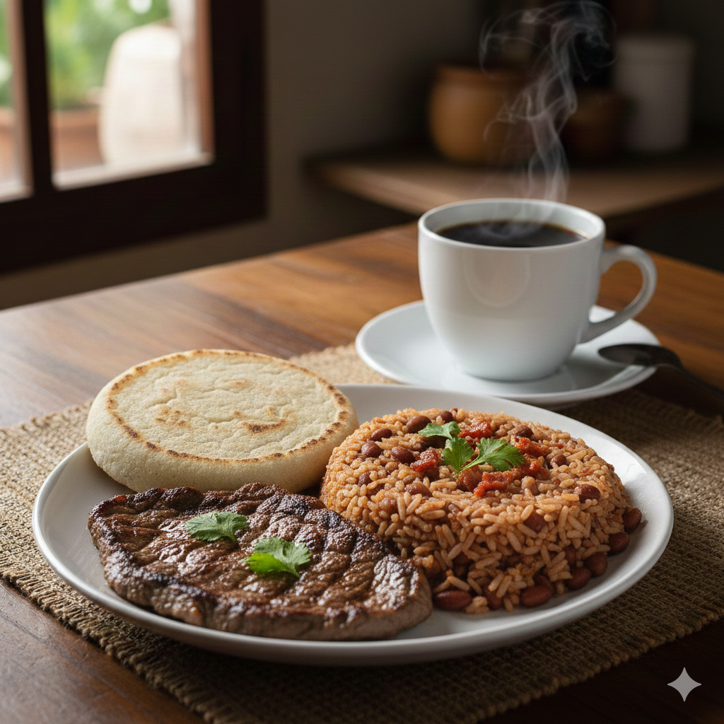 Delicioso calentado de frijoles acompañado de carne asada, tajada.