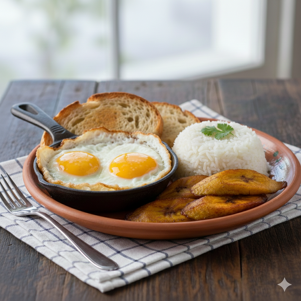 Delicioso calentado de frijoles acompañado de pollo asado, tajada.