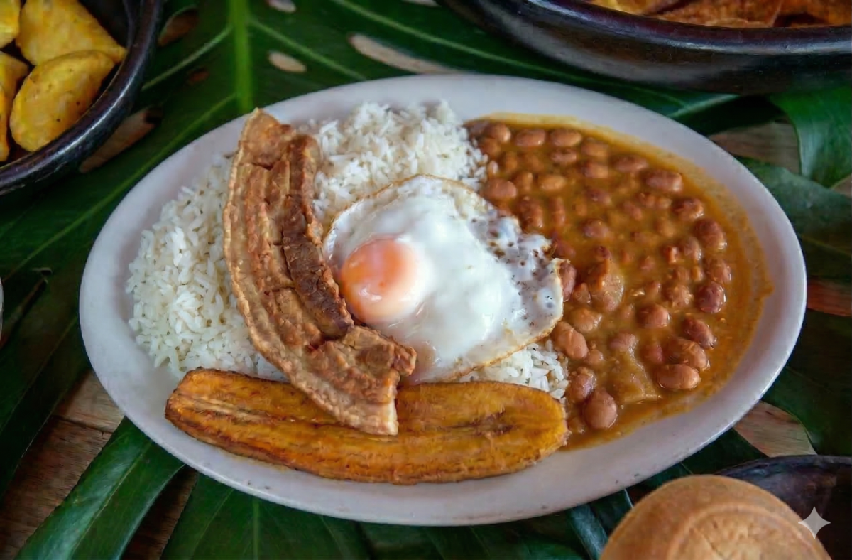 Frijoles, arroz, chicharrón, huevo, tajada.