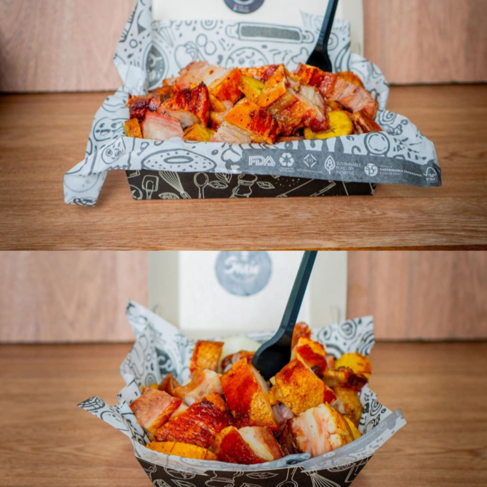 180 gr de costilla, 150 gr de chicharron totiado, 100 gr de chorizo, 80 gr de platano maduro, 150 gr de papa cocinada + papas