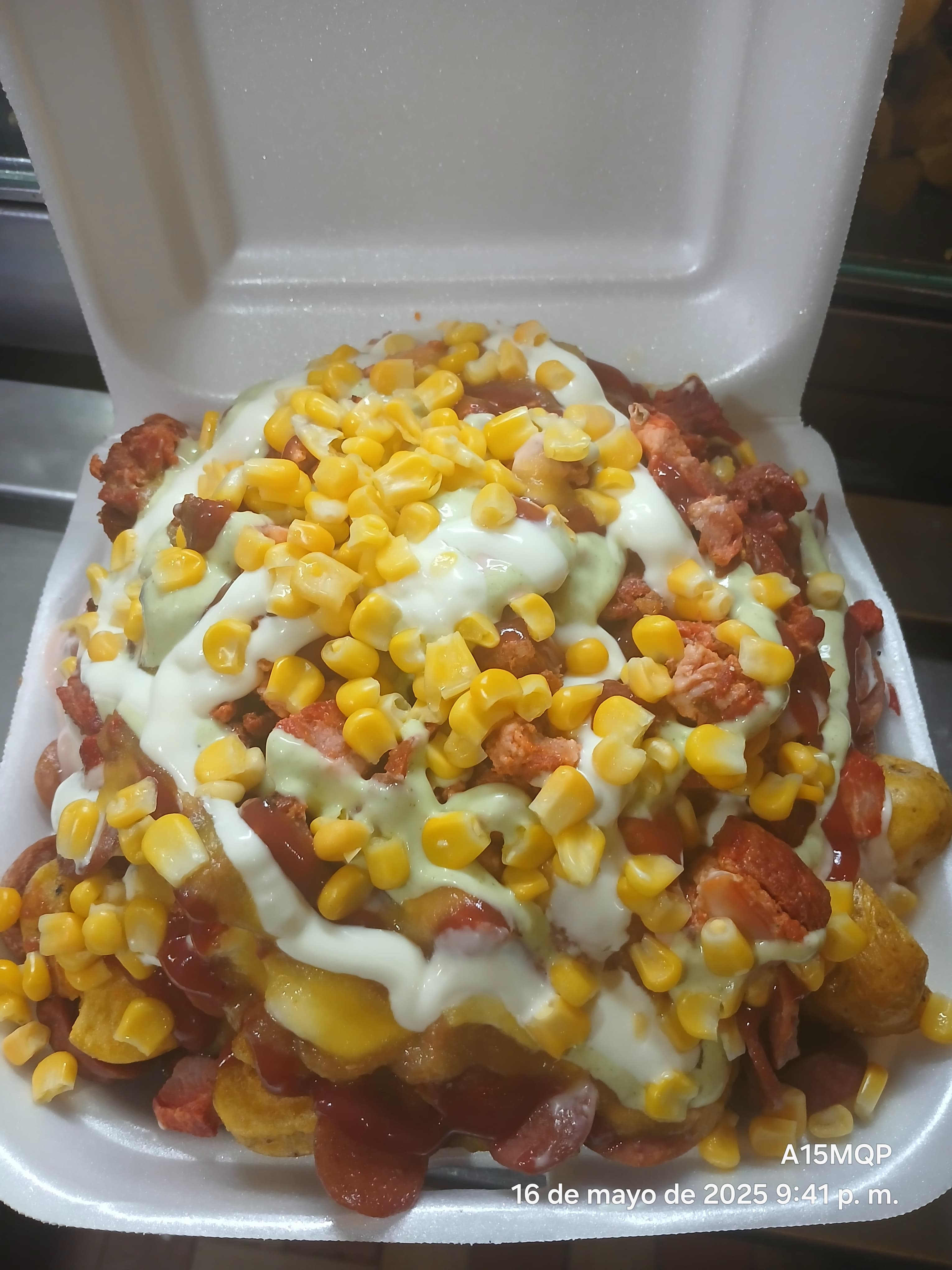 Papa, salchicha, salsas, costilla, chorizo, carne de asada, queso, tocineta,pollo desmechado y maicitos