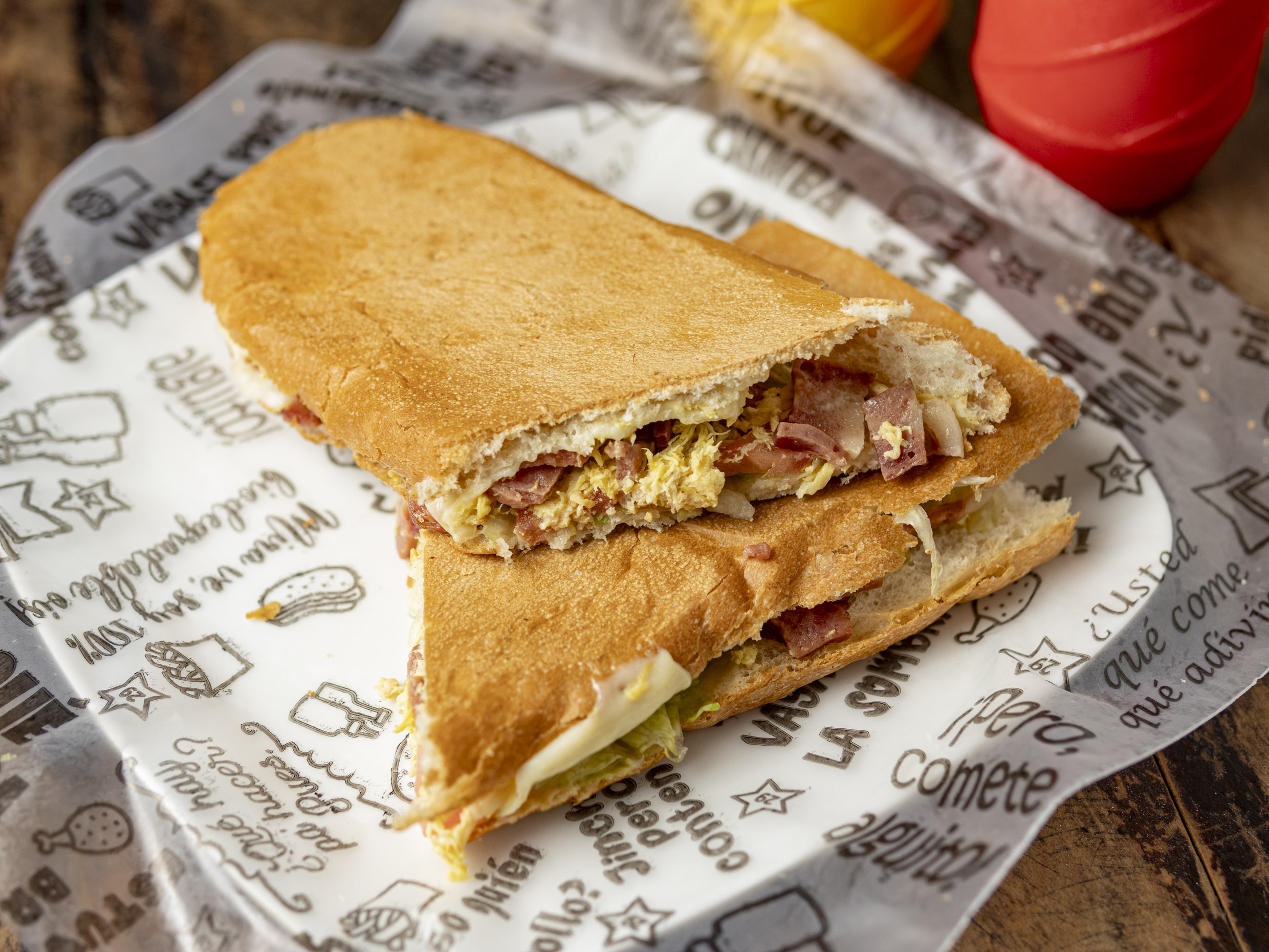 Pan, tocineta, queso, cebolla frita, piña calada, ripio, salsas
