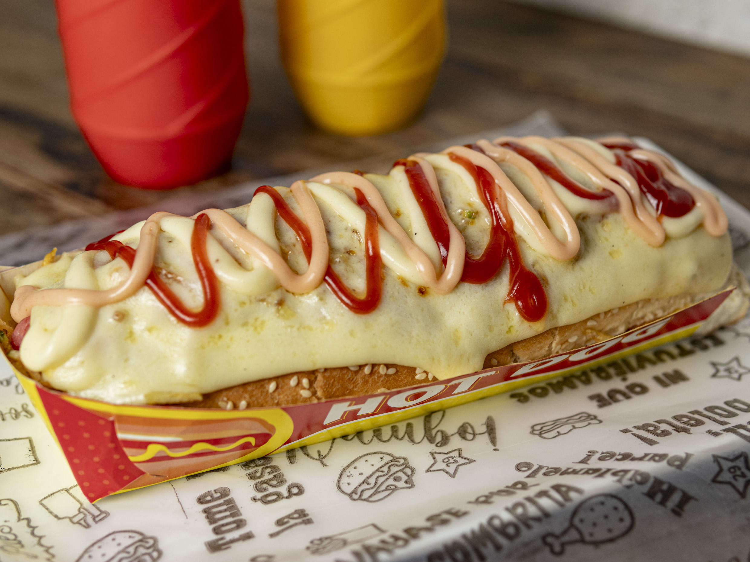 Pan, salchicha, cebolla frita, piña calada, ripio, triple queso, tocineta, salsas,pollo desmechado