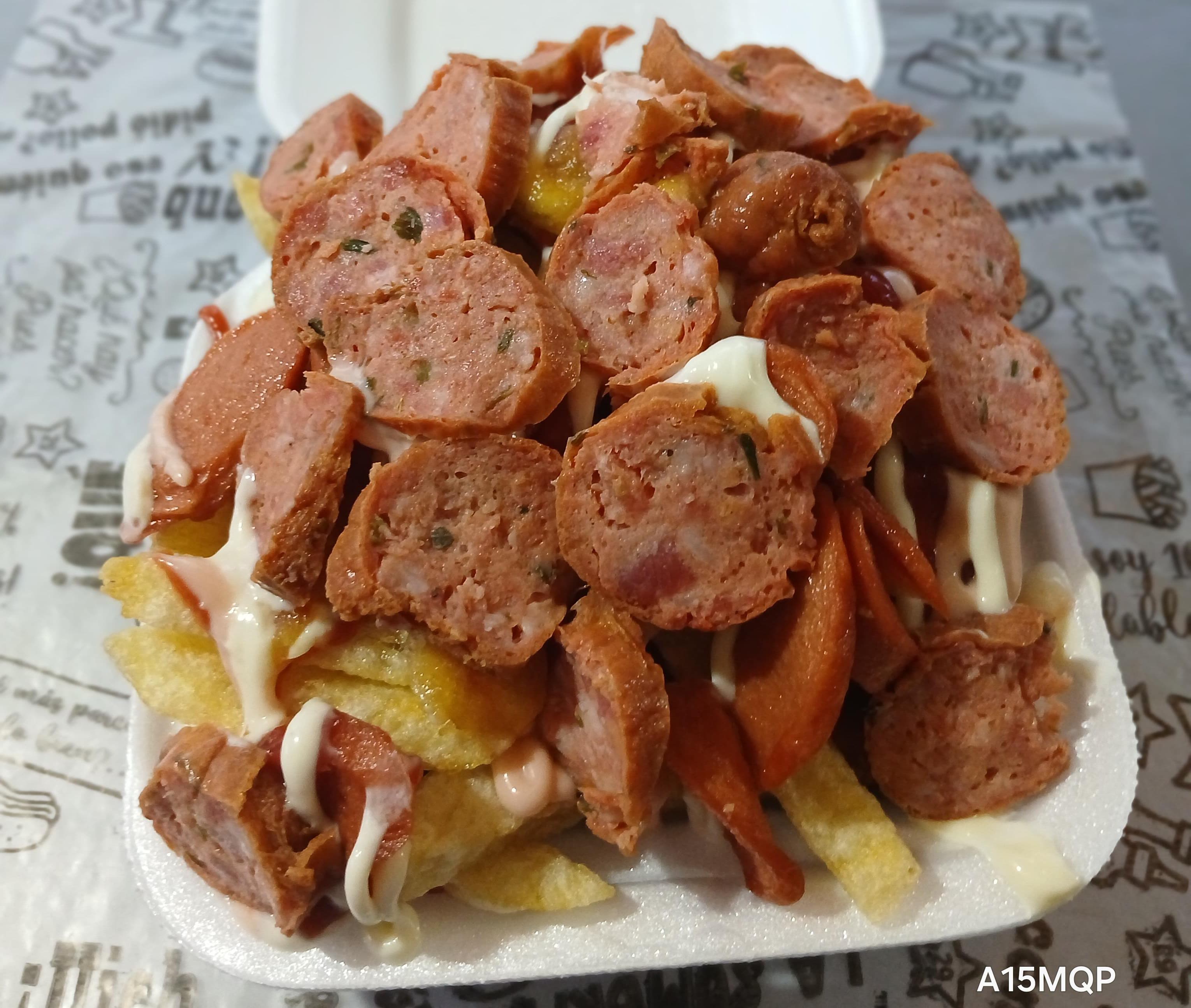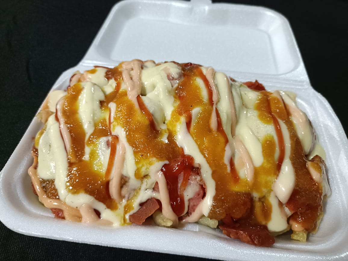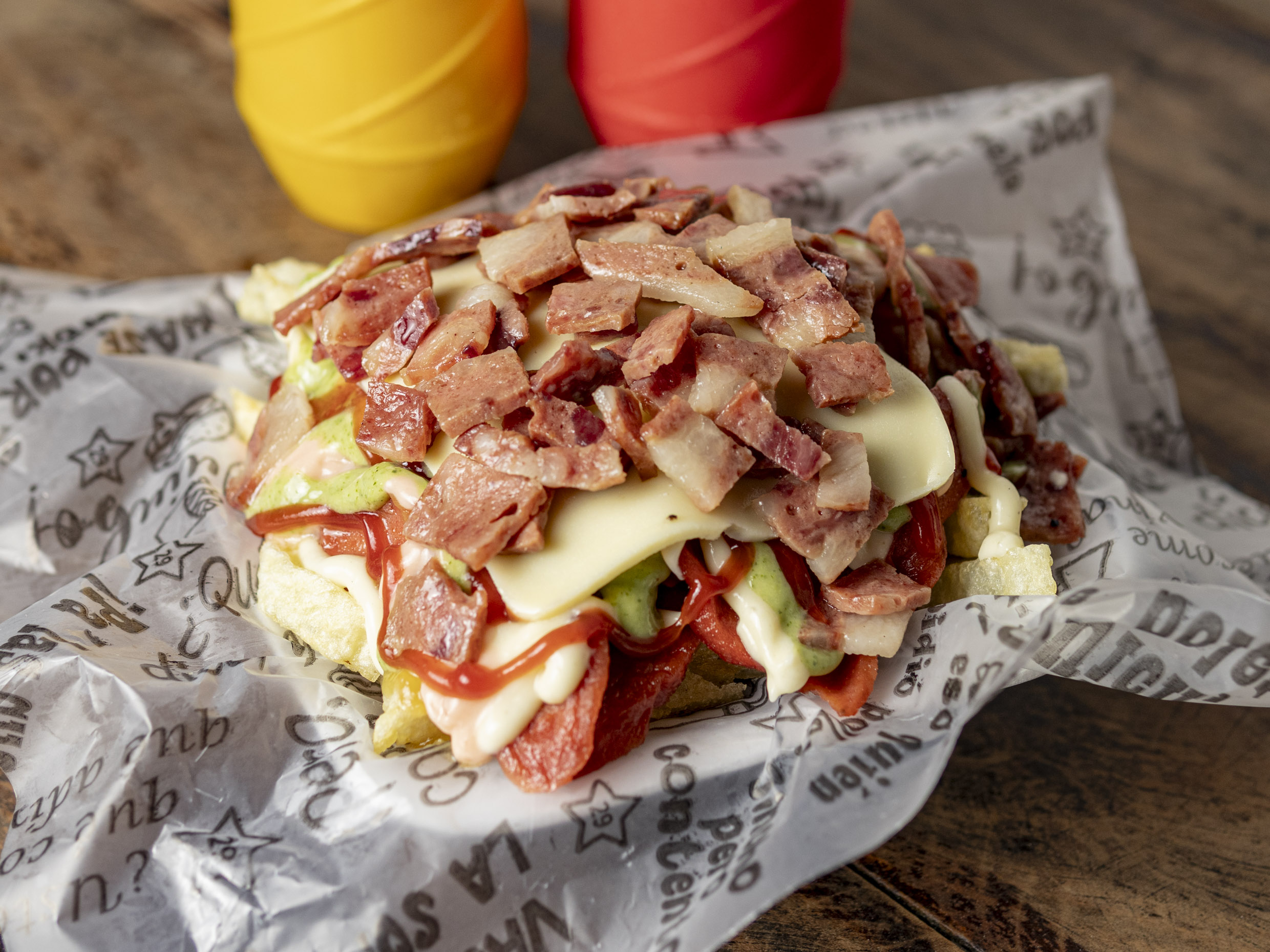 110 gr de Papa a la francesa y 110 gr de papa criolla, salchicha, tocineta, triple queso y salsas