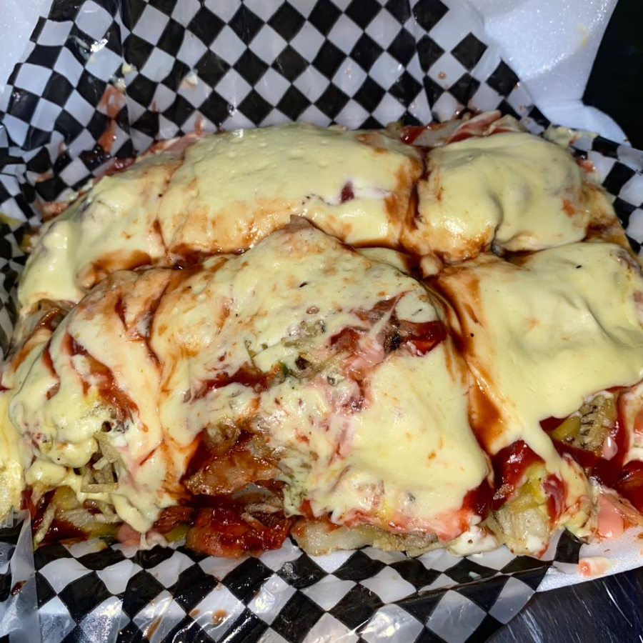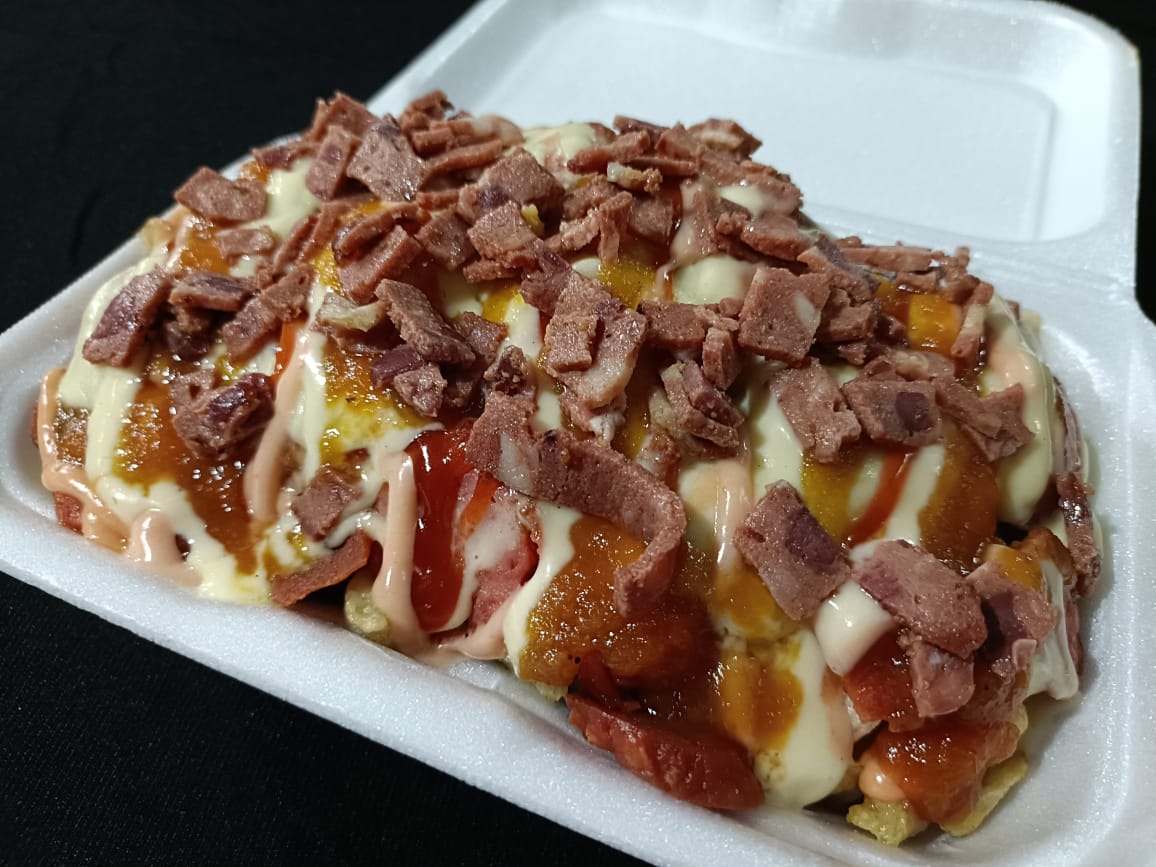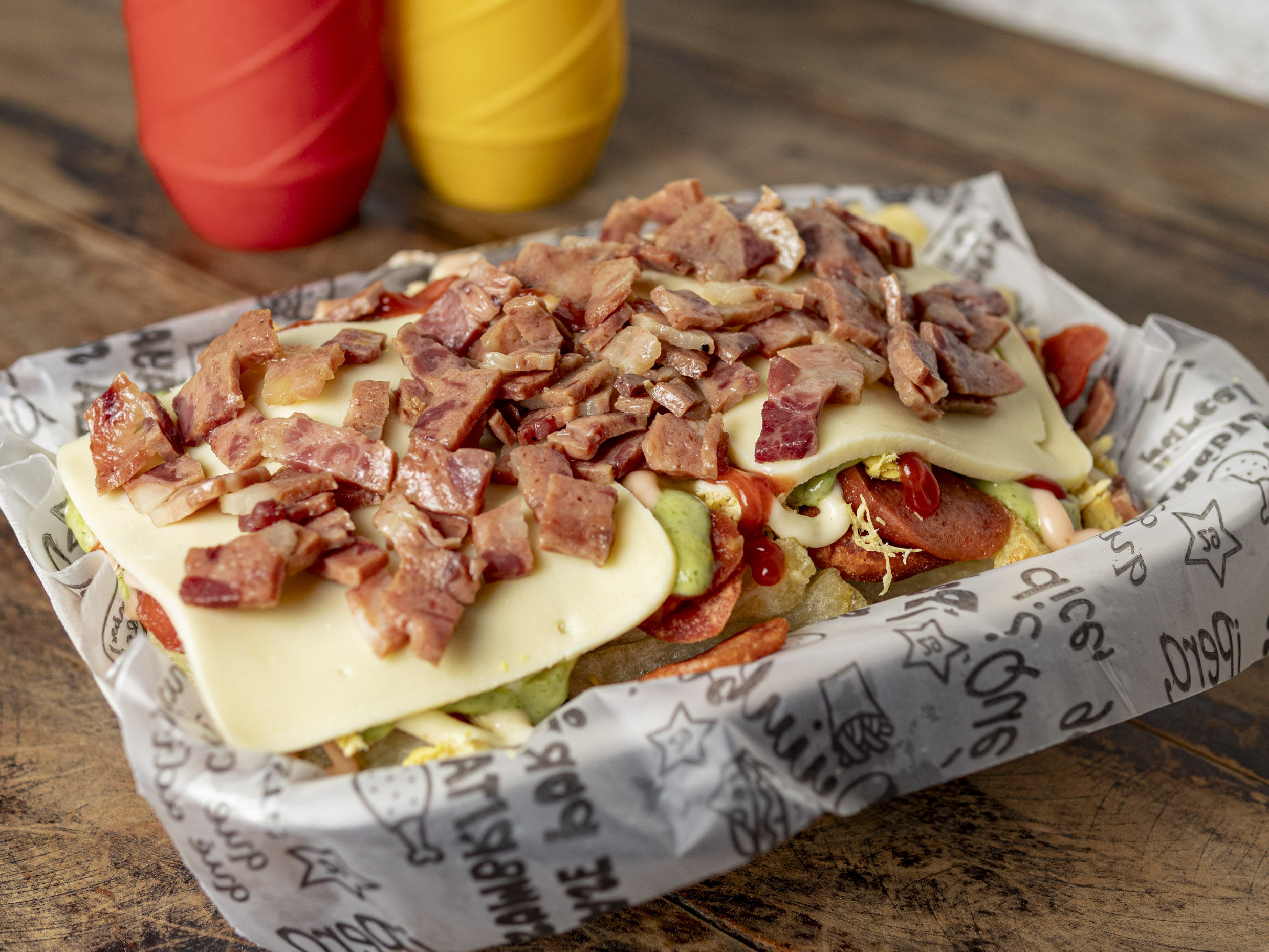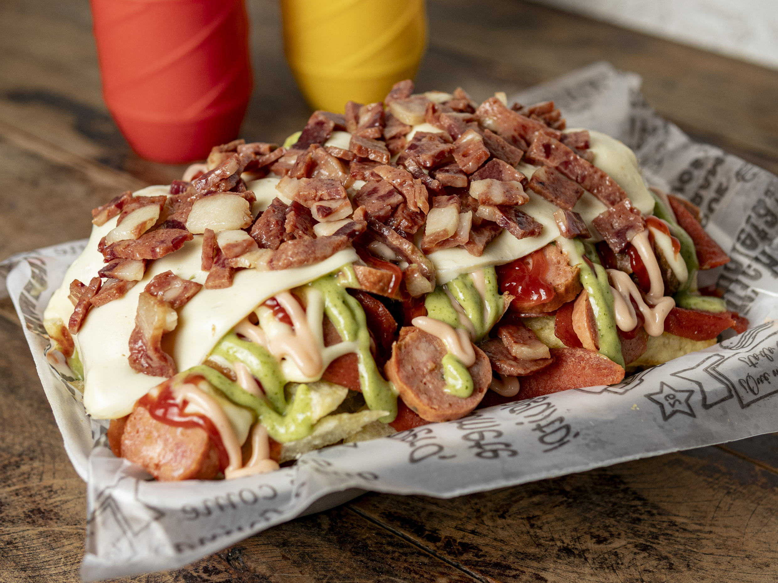 110 gr de Papa a la francesa y 110 gr de papa criolla, salchicha, tocineta, triple queso y salsas