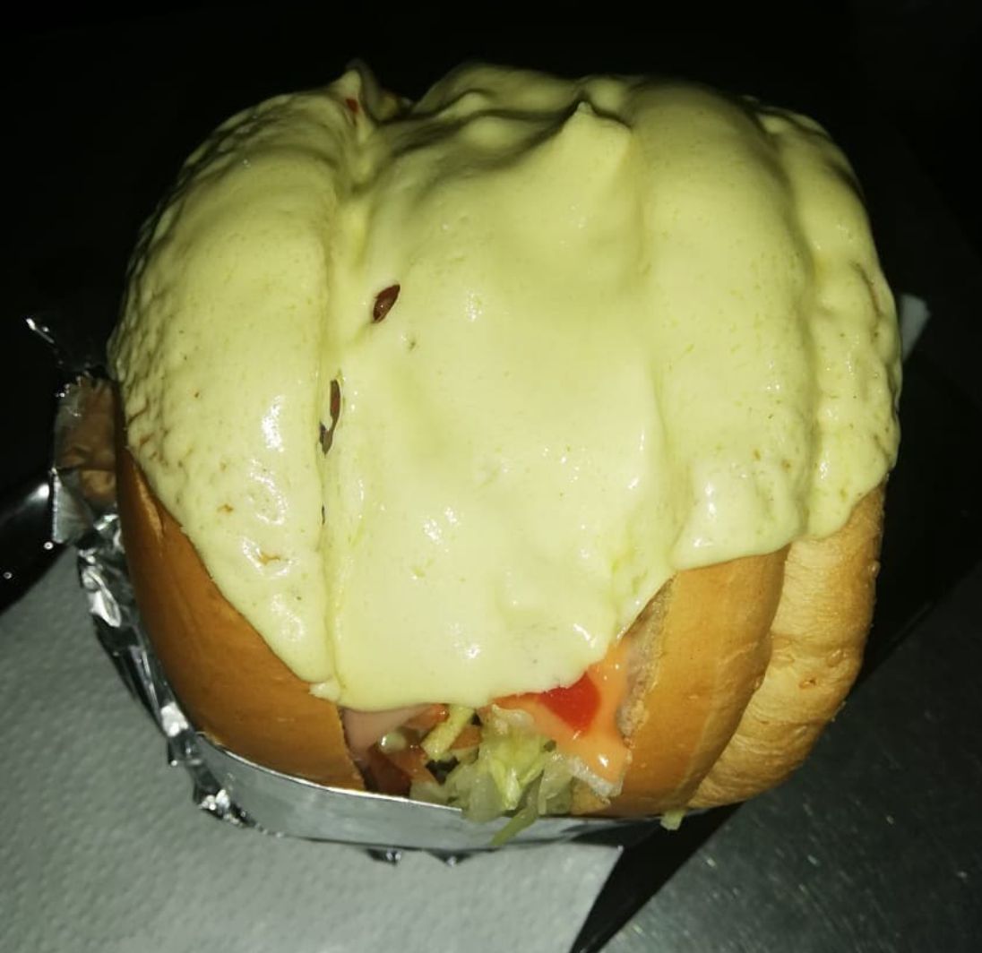 Pan, batavia, tomate, ripio, cebolla frita, carne, tocineta, jamon, queso, pila calada