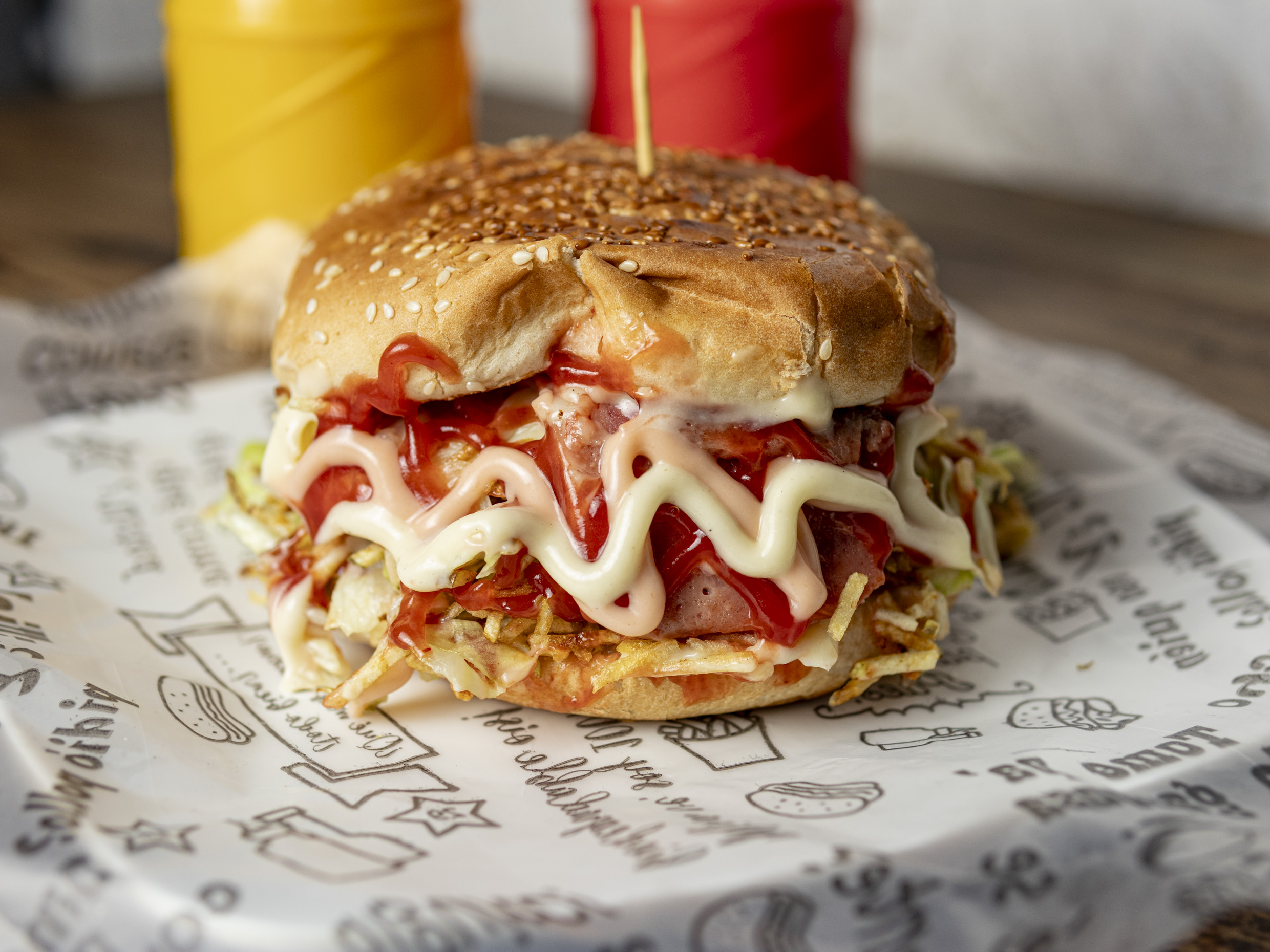 Pan, batavia, tomate, ripio, piña calada, carne, jamón, queso, cebolla frita, tocineta, salsas