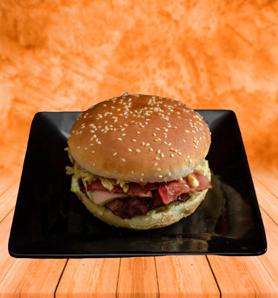 Doble carne de res 260 g, doble queso, tocineta, jamón de pierna, lechuga, tomate y cebolla.