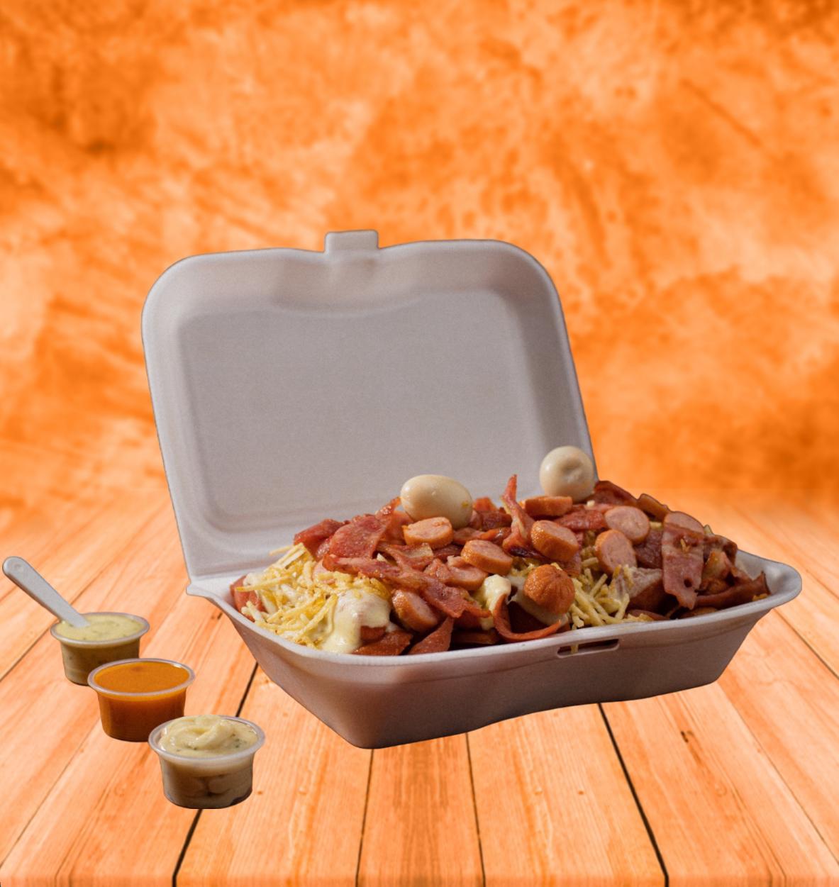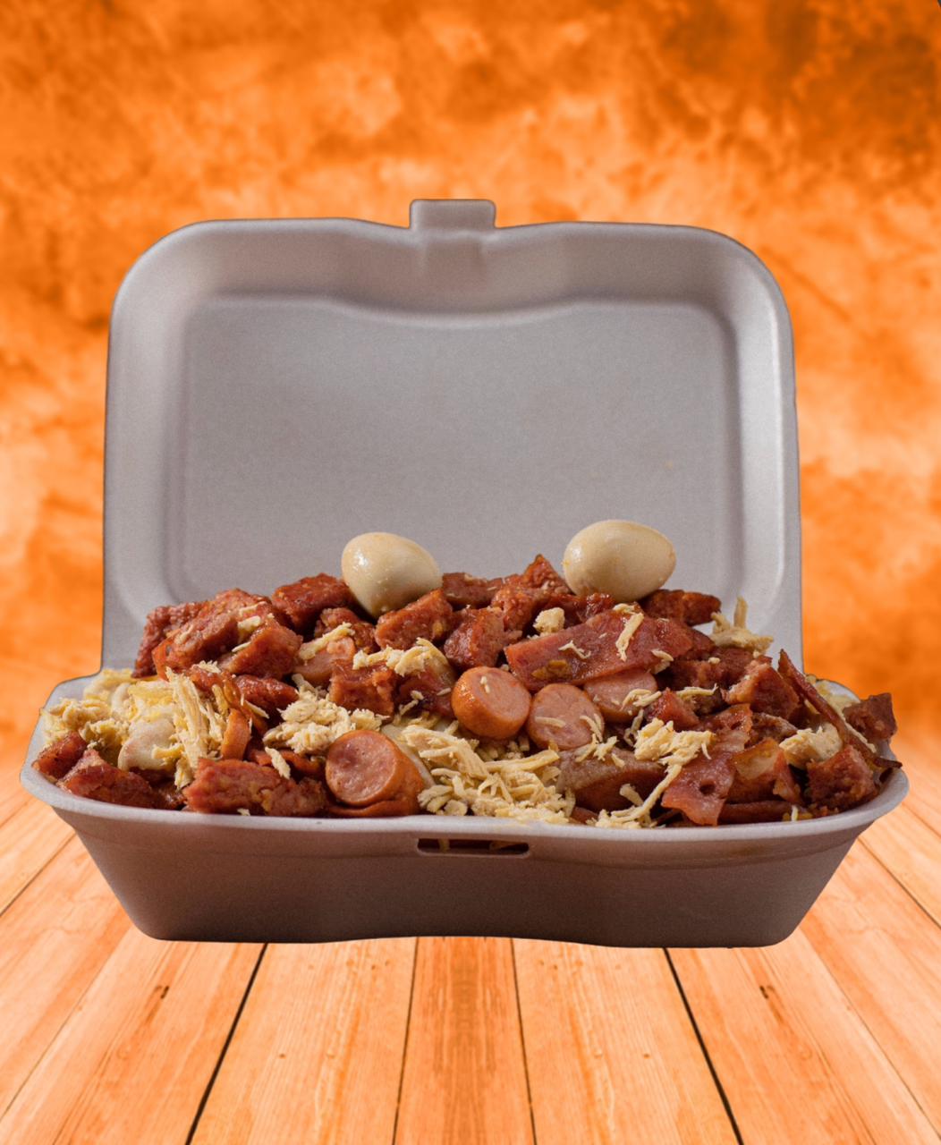 Salchicha 380Gr, papa 500Gr, queso, ripio, Rancheras, tocineta, pollo, carne de hamburguesa, 2 huevitos de codorniz, chorizo, chicharrón y salsa a elegir.